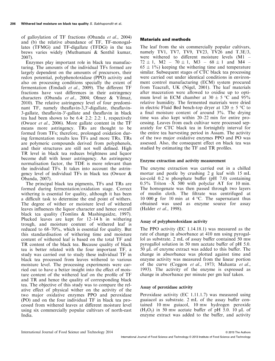 红茶的主要组分TFs和TRS是在发酵/氧化阶段形成的。尽管很难确定何时终止萎凋,恰当萎凋程度对质量至关重要。萎凋程度和萎凋叶的含水量影响茶汤的品质,进而影响红茶总的品质。采摘鲜叶摊放在萎凋槽12-14h,萎凋叶的含水量降低至68%-70%,这对于质量是至关重要的。但这种标准化的萎凋时间和萎凋叶的含水量要在红茶TFs和TRs总量的基础上。因为红茶品质与四种主要的TF更相关,有研究处理萎凋叶至不同含水量并红茶中单体TF含量。该实验很好地研究了萎凋叶的含水量对TFs和TRs的形成的影响和对相应的红茶品质的影响。本研究以来自印度东北部6种商业热门的品种为材料,红茶加工中将萎凋叶萎凋至不同含水量,目的是比较物理萎凋对两大氧化酶即多酚氧化酶(PPO)和过氧化物酶(PO)的活性和四种单体TF的相对影响。