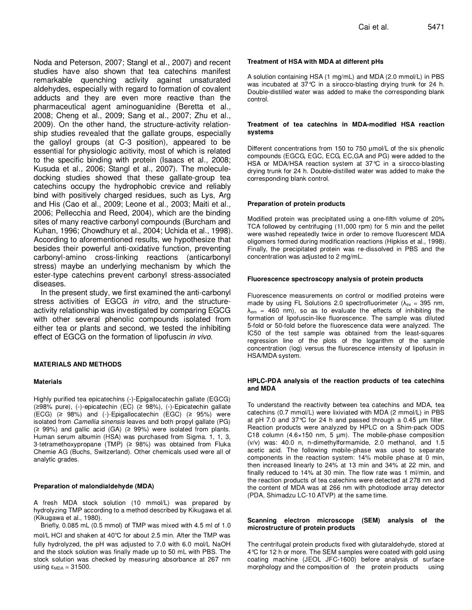 为了明确茶儿茶素和MDA间的反应,用MDA (2 mmol/L)加入Ph7.0的PBS中,37℃24h浸没出茶儿茶素,通过0.45micro;M滤波器。反应产物用Shim pack ODS C18色谱柱(4.6times;150 nm, 5 micro;m)高效液相分析。流动相组成(体积/体积)是:40 N,N-二甲基甲酰胺、2甲醇和1.5乙酸。以下流动相是用来分隔反应体系中的组分:14%流动相0min,在13min线性增加至24%,22min至34%,最后在30min减少至14%。流量是1 ml/min,茶儿茶素的反应产物在278nm处检测,