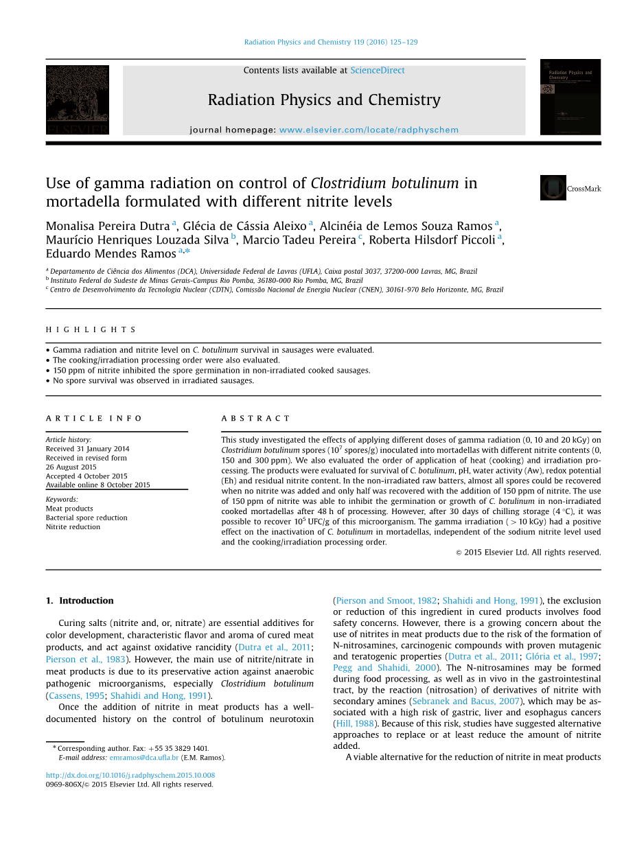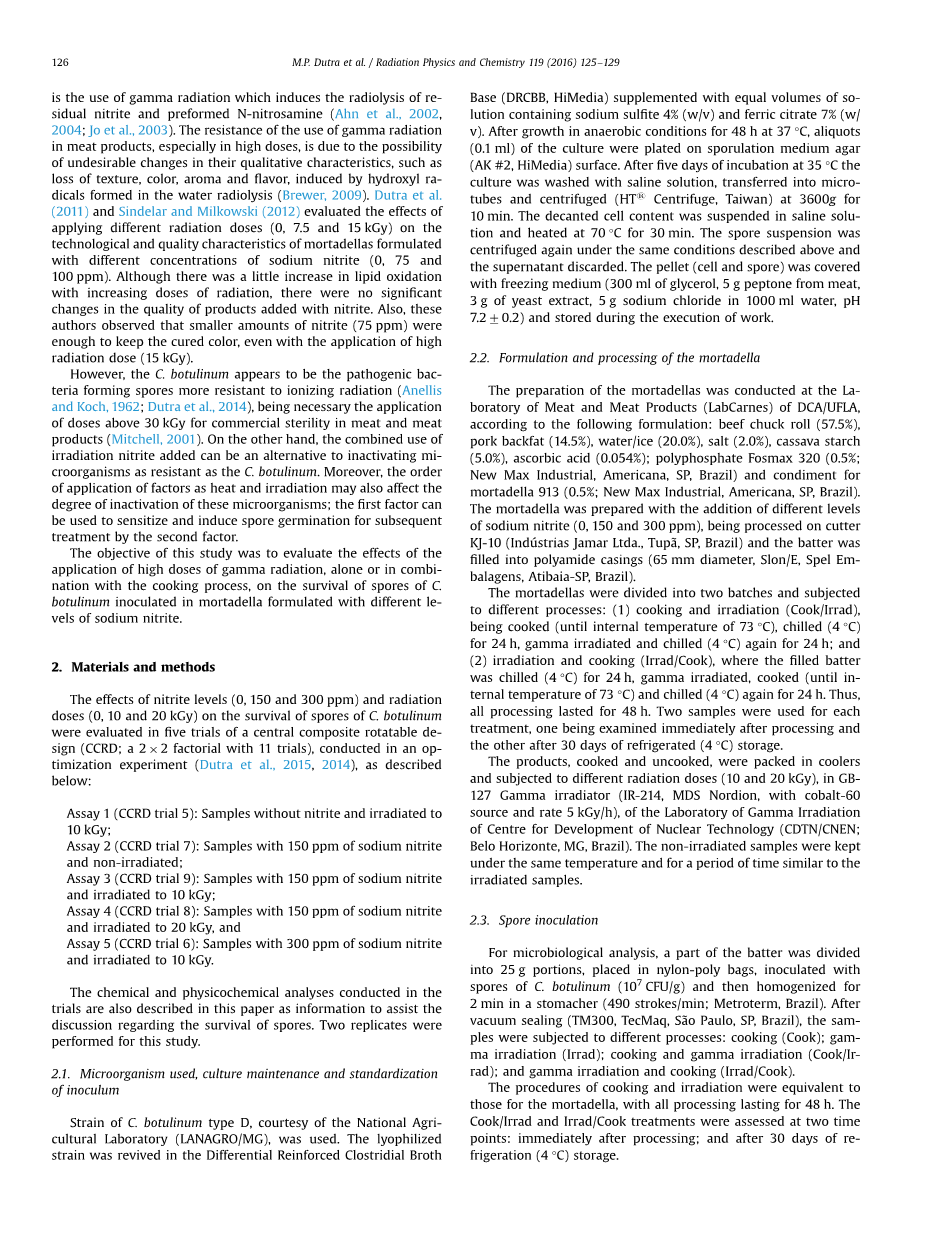 辐射物理与化学 ——利用γ射线对意式肉肠肉毒杆菌的使用控制制定不同的亚硝酸盐的含量外文翻译资料
