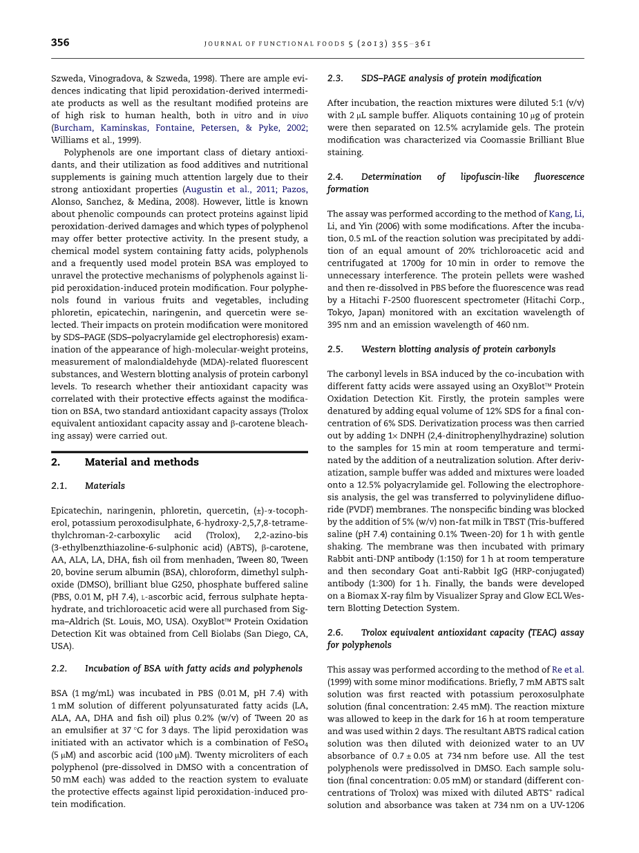 过氧化源性损害及哪些类型的多酚可以提供更好的保护活动却鲜为人知。在本研究中,一个化学模型体系含有脂肪酸,多酚和经常使用的模型蛋白BSA被用来解开对抗脂质多酚的保护机制过氧化诱导的蛋白修饰。在不同的水果和蔬菜四种多酚,被选中的包括根皮素,外延儿茶素,柚皮素,槲皮素。通过SDS-PAGE(SDS聚丙烯酰胺凝胶电泳)检测高分子量蛋白的出现、丙二醛的测定(MDA)相关的荧光物质和蛋白质羰基的免疫印迹分析水平进行监测它们对蛋白修饰的影响要研究其抗氧化能力是否与它们抵抗对BSA修饰的保护能力有关,需要两个标准的抗氧化能力试验(水溶性维生素E当量抗氧化能力测定和beta;-胡萝卜素的漂白