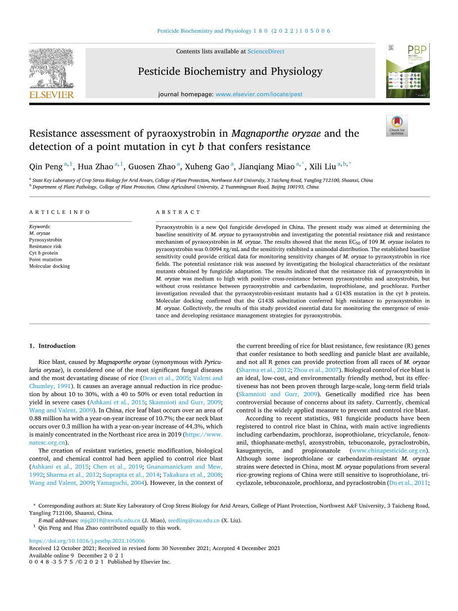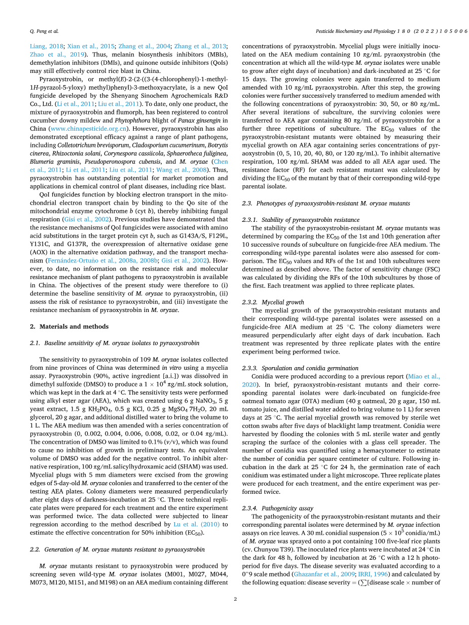 QoI杀菌剂通过结合线粒体酶细胞色素b(cyt b)的Qo位点阻断线粒体电子传递链中的电子传递,从而抑制真菌呼吸。研究表明,Qol杀菌剂的抗性机制与目标蛋白cyt b中的氨基酸替换有关,如G143A/S、F129L、Y131C和G137R,以及选择性氧化途径中选择性氧化酶基因(AOX)的过度表达以及运输机制。然而,迄今为止,在中国还没有关于植物病原菌对唑菌酯的抗性风险和分子抗性机制的信息。因此,本研究的目的是(i)确定稻瘟病菌对吡咯烷酮的敏感性,(ii)评估对吡咯烷酮的抗性风险,以及(iii)研究稻瘟病菌对吡咯烷酮的抗性机制。
