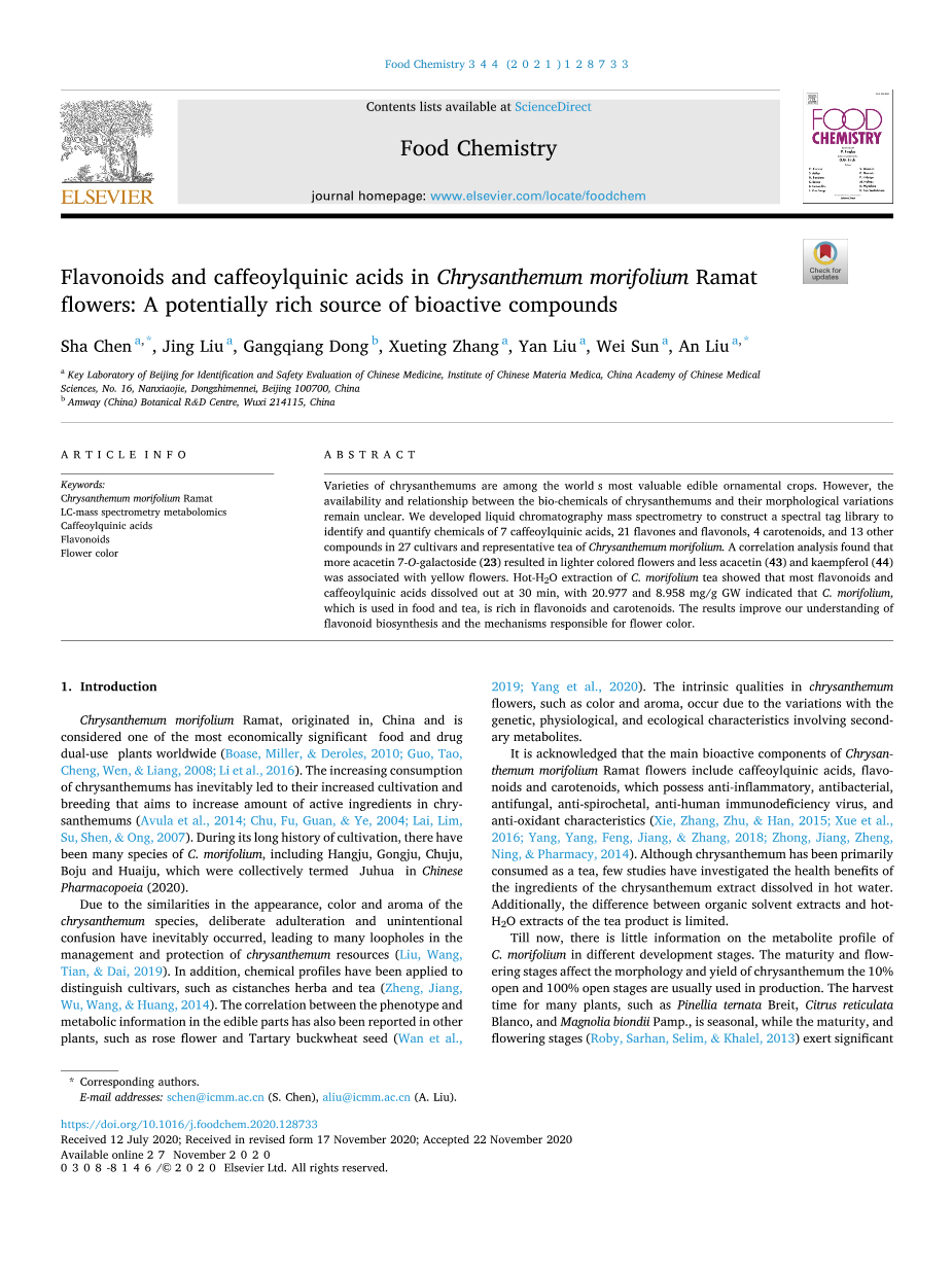 摘要:菊花品种是世界上最有价值的食用观赏作物之一。然而,菊花的生物化学物质及其形态变异之间的关系和可用性仍然不清楚。我们发展了液相色谱质谱技术,构建了一个光谱标签库,对27个菊花品种和代表性茶叶中的7种咖啡酰奎宁酸、21种黄酮和黄酮醇、4种类胡萝卜素和13种其他化合物进行了鉴定和定量。相关性分析发现,更多的acacetin 7-O-半乳糖苷(23)导致更浅颜色的花,更少的acacetin (43)和山奈酚(44)与黄色的花相关。杭白菊的热水提取实验表明,大部分黄酮类化合物和咖啡酰奎宁酸在30 min时溶出,分别为20.977和8.958 mg/g GW,表明用于食品和茶叶的杭白菊富含黄酮类化合物和类胡萝卜素。这些结果提高了我们对类黄酮生物合成和花色机制的理解。