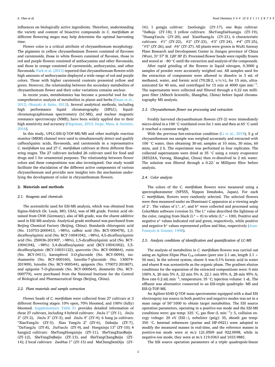 从27个栽培品种中采集了处于3个不同开花阶段的菊花头状花序:10%开放、70%开花和100%(完全)开花。补充表S1提供了这27个品种的详细资料,包括4个杂交品种:“金菊1 ′( ZY 1号)”和“金菊2′′(ZY-2号)、“晋州3′′( ZY-3号)和“晋州4 ′( ZY-4号);6杭菊品种:“小洋菊”(ZY-5)、“小杨菊2′′(ZY-6)、“大白菊”(ZY-7)、“大洋菊”(ZY-8)、“九月菊”(ZY-9)、“红新菊13′′(ZY-10);杭菊2号品种4个:“射阳红心菊”(ZY-11)、“射阳小白菊”(ZY-12)、“射阳大白菊”(ZY-13)、“射阳长白菊”(ZY-14);2个地方品种:“早花1号”( ZY 15号)和“麻城本地菊”( ZY-16);1个贡桔品种:“早贡菊”(ZY-17),1个博菊品种:“大博菊”(ZY-18);3个黄色品种:“射阳大黄菊”(ZY-19)、“黄药菊”(ZY-20)、“小黄菊”(ZY-21),6个特色品种:“# 1 ′( ZY-22)、“# 2 ′( ZY-23)、“# 3 ′( ZY-24)、“# 4 ′( ZY-25)、“# 5′′(ZY-26)和“# 6′′(ZY-27)”。所有植物都生长在无锡安利中国江苏省植物研发中心(无锡,北纬31° 57′,东经120° 30′)。将加工过的花头快速冷冻并储存在80°C,直到提取和分析化合物。在液氮中快速研磨花朵后,精确称出0.3000 g粉末样品。将所有用于提取成分的样品溶解在3 ml甲醇、水和甲酸(70:28:2,v/v/v)混合15 min,超声处理40 min,并以4000 rpm/min离心15 min。在液相色谱质谱分析之前,收集上清液并通过0.22 nm微孔过滤器(Alltech Scientific,上海,中国)过滤。