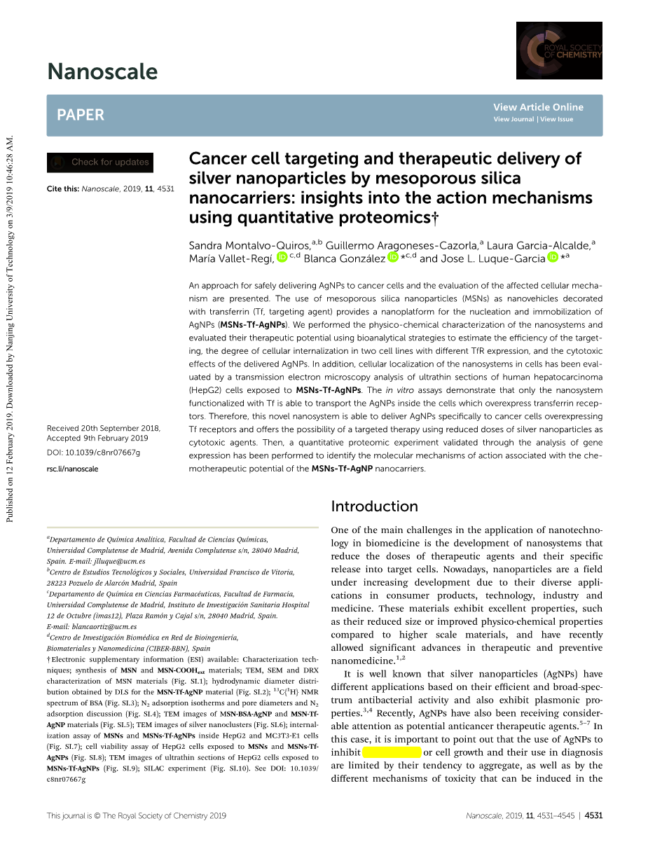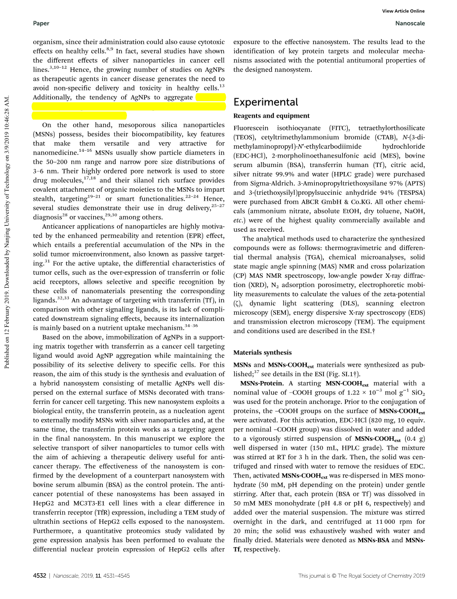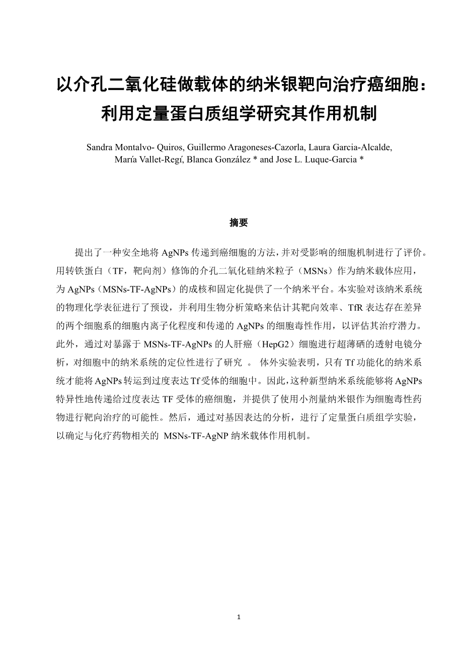 以介孔二氧化硅做载体的纳米银靶向治疗癌细胞: 利用定量蛋白质组学研究其作用机制外文翻译资料