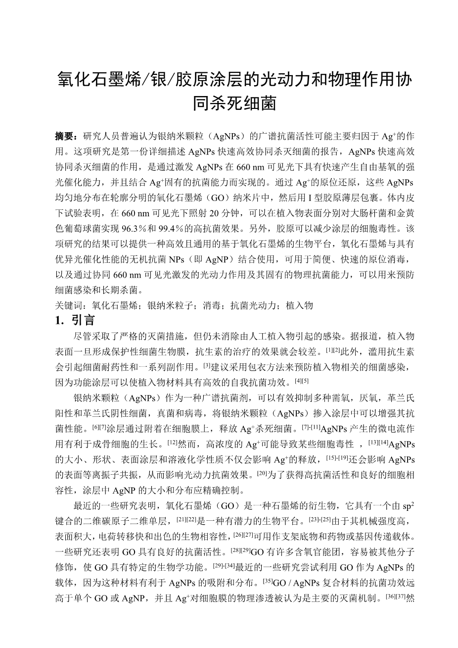 氧化石墨烯/银/胶原涂层的光动力和物理作用协 同杀死细菌外文翻译资料