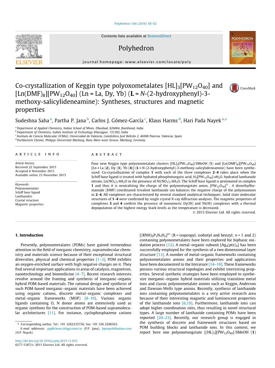 Sudeshna Sahaa,Partha P.Janab,Carlos J.Goacute;mez-Garciacute;ac,Klaus Harmsd,Hari Pada Nayeka,*