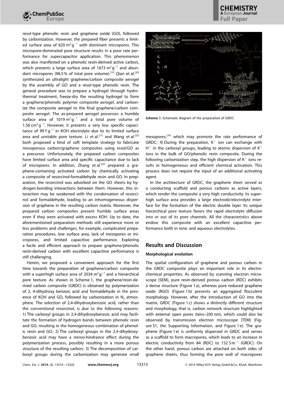 最近,将石墨烯纳米片与其他碳纳米材料(如活性炭、碳气凝胶、碳纳米管、碳球和炭黑)等结合提供了一个新思路防止石墨烯纳米片聚合从而提高以石墨烯为基础的电极材料的性能。已有研究表明酚醛树脂是制作石墨烯-碳复合材料的灵活的前驱体。例如Bai等以低分子量的甲阶型酚醛树脂和氧化石墨烯(GO)为原料,通过静电纺丝合成了超细纤维,然后碳化。然而,所制备的纤维的孔中微孔占优势,比表面只有620 m2·g-1。 这个微孔主导的孔结构导致超级电容器应用时充放电速率不理想。这种现象也表现在酚醛树脂衍生的活性炭上,其具有1673 m2·g-1的大表面积和丰富的微孔(占总孔体积的96.5%)。Qian等人通过装配GO和甲阶型酚醛树脂合成了超轻型石墨烯/碳复合气凝胶。一般过程是通过水热法制备水凝胶,冷冻干燥所得水凝胶以形成石墨烯/酚醛聚合物复合气凝胶,并将复合气凝胶碳化为最终的石墨烯/碳复合气凝胶。 所制备的气凝胶具有1019 m2·g-1的表面积和1.56 cm3·g -1的总孔体积。但是由于比表面积相对较小和不稳定的孔结构,它在KOH电解液中呈现出只有99 F·g-1的很小电容。Li等人和Wang等人提出了一种以甲阶型酚醛树脂/氧化石墨烯作为前驱体,用软模板法来制造介孔碳/石墨烯复合材料。不幸的是,由于缺乏微孔,制备的碳复合材料具有有限的表面积和比电容。此外,Zhang等人通过化学活化间苯二酚-甲醛树脂和氧化石墨烯的复合材料制备了含石墨烯的活性炭。在此过程中,间苯二酚通过氢键作用吸附在氧化石墨烯薄片上。然而,这种相互作用可以随着间苯二酚和甲醛的缩合而变弱,导致石墨烯在所得碳基质中的不均匀分散。此外,即使它们用过量的KOH活化,所制备的碳复合材料具有微小的表面积。迄今为止,上述制备方法仍然存在着或多或少的问题和挑战,例如,复杂的制备程序,低比表面积,缺乏介孔或微孔,以及有限的电容性能。探索一种简单有效的方法来制备具有优异的电容性能的石墨烯/酚醛树脂衍生碳复合材料仍然面临着不小的挑战。