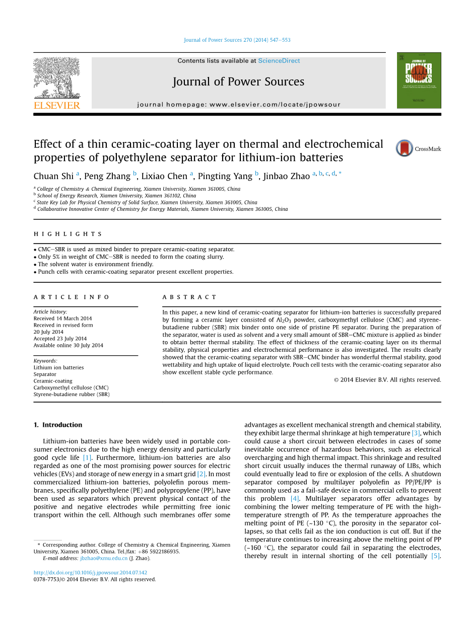薄陶瓷涂层对锂离子电池聚乙烯隔膜的热和电化学性能的影响