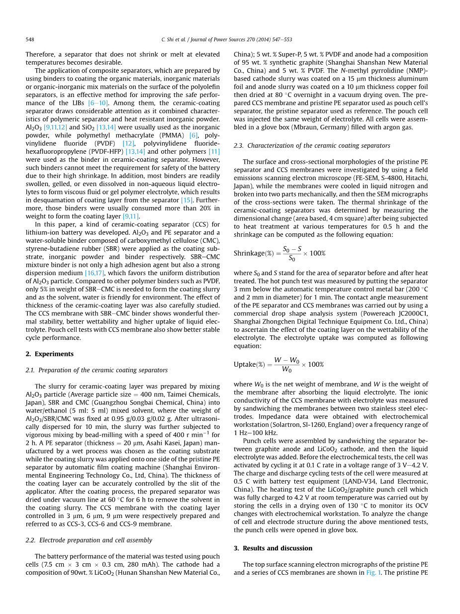 通过使用荧光扫描电子显微镜(FE-SEM,S-4800,日立,日本)研究原始PE隔膜和CCS膜的表面和横截面形态。将膜置于液氮中冷却分成两部分,然后拍摄横截面的SEM显微照片。陶瓷涂层隔膜的热收缩率通过在各种温度下经历0.5 h的热处理之后测量尺寸变化(初始面积,4 cm 2)来确定,并且收缩率可以如下式: