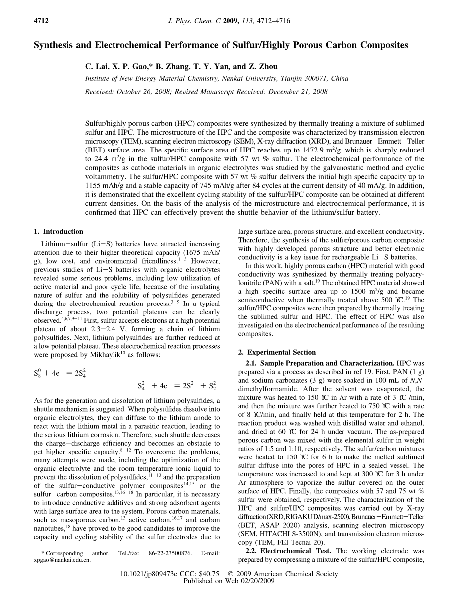 为提高锂硫充电电池的电化学性能,使用了一种比表面积达1472.9m2/g的高度多孔碳材料作硫正极材料的导电基质和吸收剂。通过热处理硫和HPC混合物,硫能在HPC孔道中高度分散嵌入。含硫57%的硫/HPC复合物在40mA/g的电流密度下首次比容量高达1155mAh/g,经84次循环后容量稳定在745mAh/g。特别地,经三天闲置,复合物在40mA/g 电流密度下110次循环后,仍展现出770mAh/g的高容