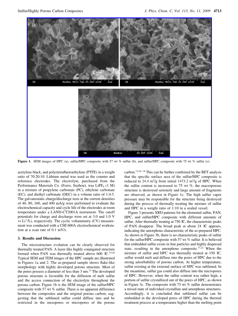我们通过热处理聚丙烯腈和盐合成了导电性能良好的HPC材料,19所得HPC材料具有高达1500m2/g的比表面积,加热至500℃以上成为半导电体。19之后,热处理升华硫和HPC制备了硫/HPC复合物。研究还发现HPC在电化学上对于生成复合物也起到了作用
