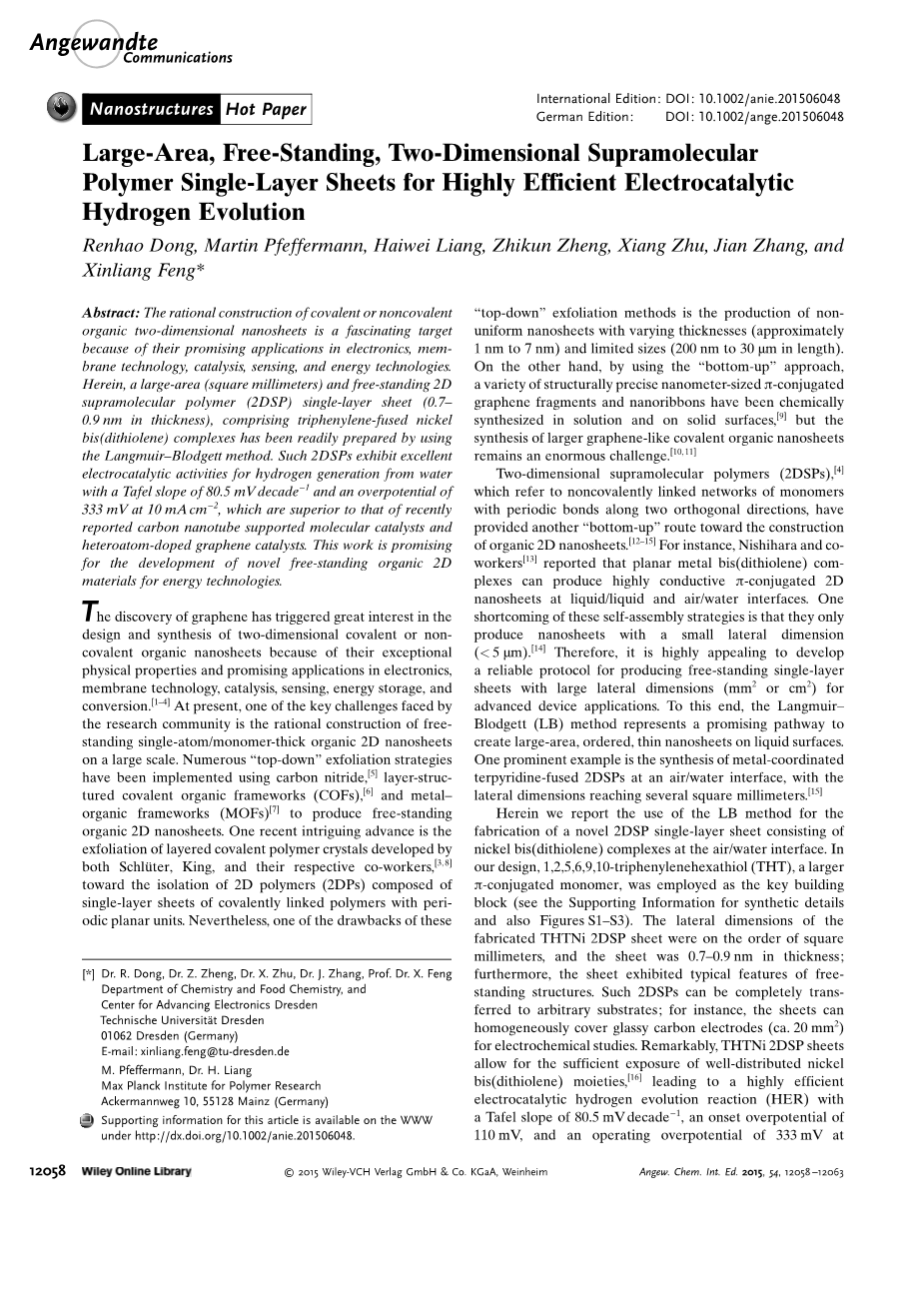 在这里我们报告使用LB方法一种新型2DSP单层片的制造镍双(二硫戊烯)络合物在空气/水界面。在我们的设计,1,2,5,6,9,10-三苯二甲硫醚(THT),较大对共轭单体作为关键建筑块(有关合成细节,请参阅支持信息以及图S1-S3)。的横向尺寸制造的THTNi 2DSP片材均为正方形毫米,片材厚度为0.7-0.9纳米;此外,该片材具有独立结构的典型特征。这样的2DSP可以完全转移到任意的底物上;例如,纸张可以均匀地覆盖玻璃碳电极(约20mm2)用于电化学研究。值得注意的是,THTNi 2DSP床单允许充分分布均匀的镍双(二硫戊烯)部分,[16]导致高效电催化氢析出反应(HER)与一个塔夫尔坡度为80.5 mVdecadecent;1,起始超电势为110 mV,在10 mAcmcent;2时工作电压为333 mV,优于近期报道碳纳米管(CNT)支持的分子催化剂[17]和掺杂杂质的石墨烯催化剂[18]所以我们的工作为合理建设提供了吸引人的策略大面积,独立的2DSP纳米片用于能源应用。
