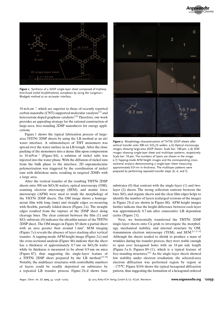 图1显示了大型THTNi 2DSP片材的典型制造工艺,通过使用LB法在空气/水界面。 THT单体的亚单层是分布在LB槽的水面上。 关闭后压缩后将单体包装成致密膜至10mNmcent;1(图S4),镍盐溶液为注入水相。 随着镍离子的扩散从体相到界面,2D超分子聚合由镍的配位触发离子与二硫烯单元,导致目标2DSPs与大面积。