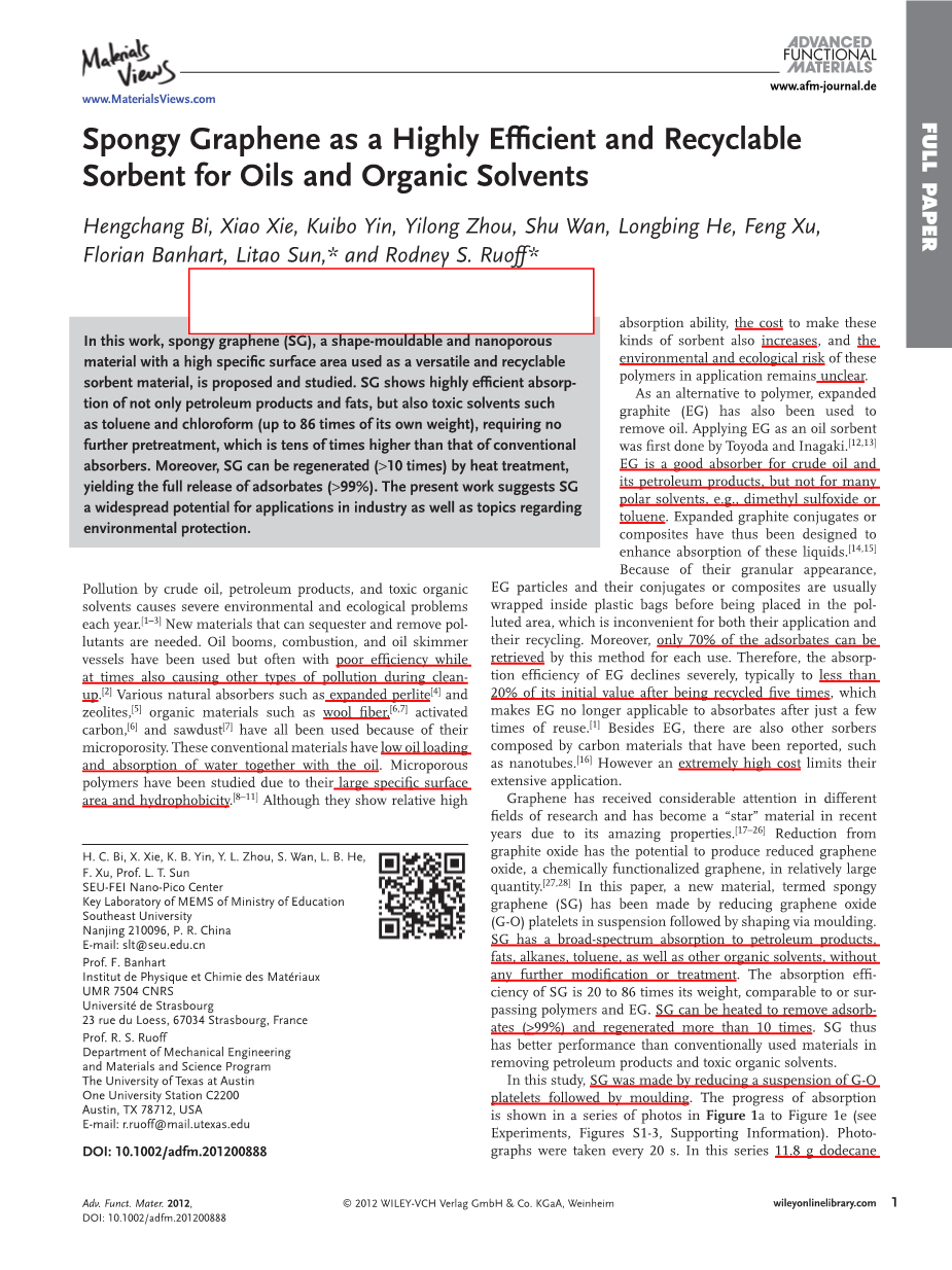 石墨烯在不同的研究领域受到了相当的关注,并且由于其惊人的性能而成为近年来的“明星”材料。[17–26]氧化石墨的还原有可能产生相对较少的氧化石墨烯(一种化学功能化的石墨烯) [27,28]在本文中,通过减少悬浮体中的氧化石墨烯(GO)薄片,然后通过模塑成型,制备了一种称为海绵状石墨烯(SG)的新材料。 SG对石油产品,脂肪,烷烃,甲苯以及其他有机溶剂具有广泛的吸收能力,无需任何进一步的改性或处理。 SG的吸收效率是其重量的20-86倍,可与聚合物和EG相媲美或超过。 SG可以被加热以去除吸附 -