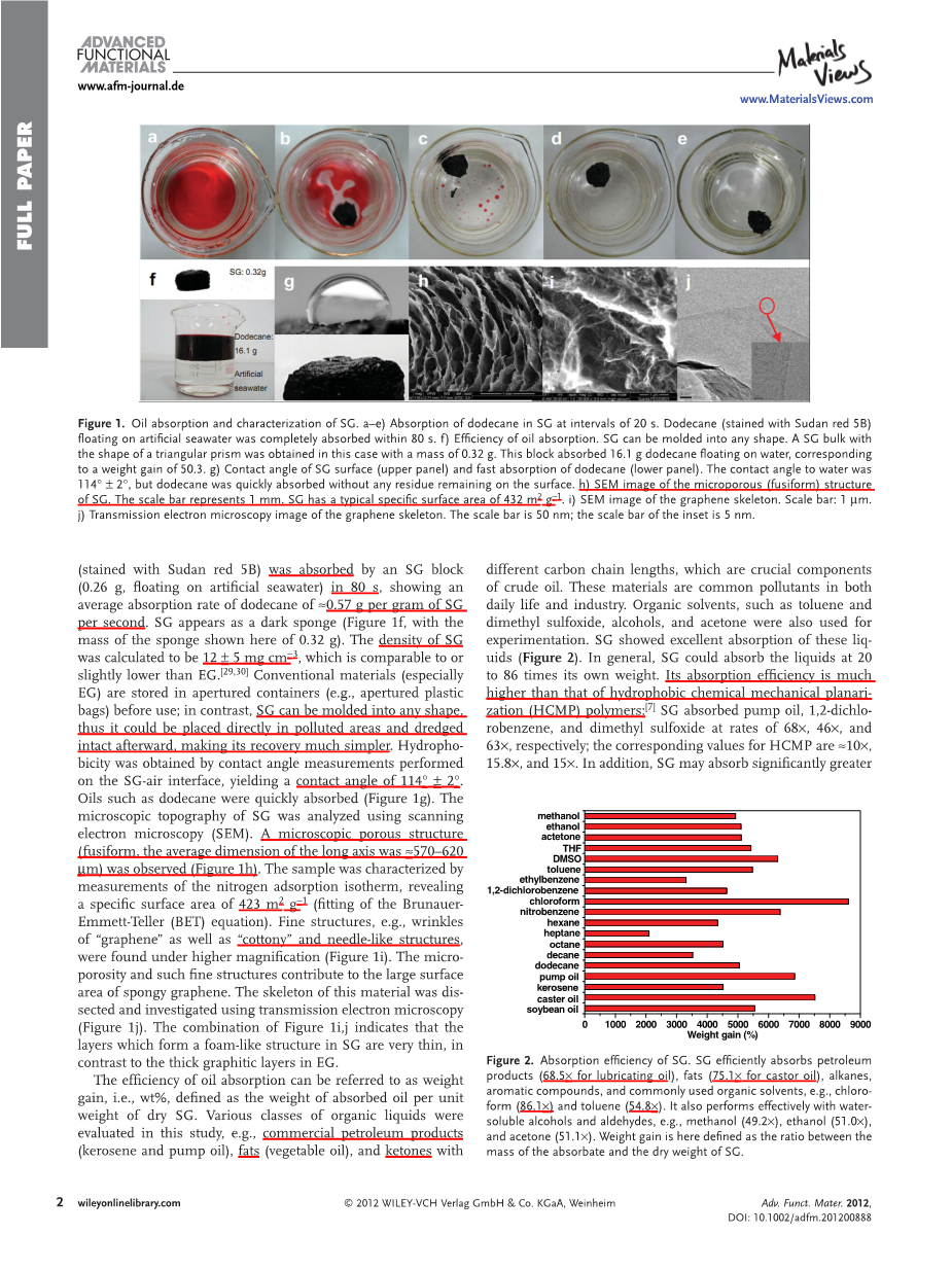 在这项研究中,SG是通过减少GO血小板的悬浮液,然后模塑而制成的。 吸收的进展在图1a到图1e的一系列照片中显示(参见实验,图S1-3,支持信息)。 照片每20秒拍摄一次。 在这个系列11.8克十二烷