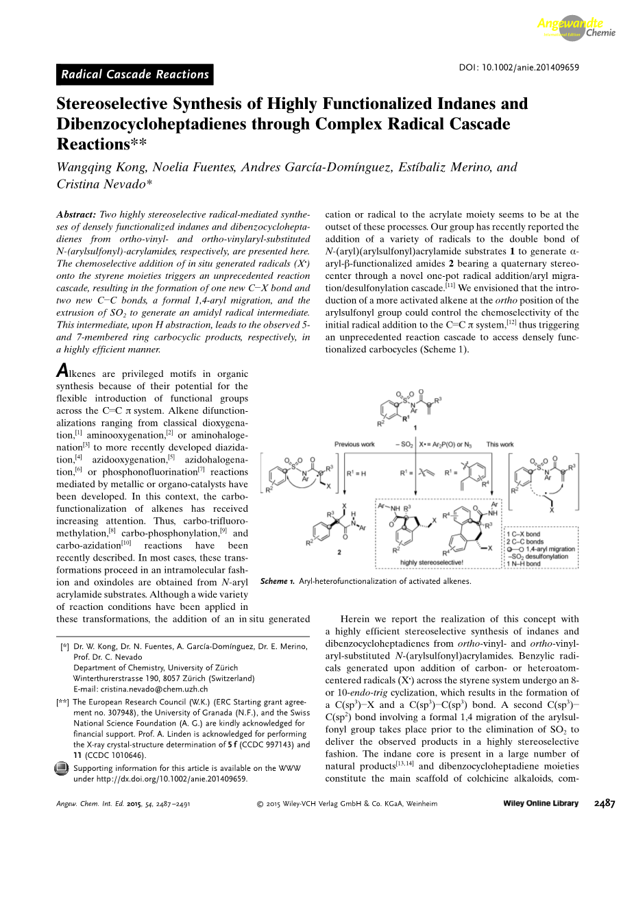注:此篇译自W. Q. Kong, N. Fuentes, A. Garcia-Dominguez, E. Merino, C. Nevado, Angewandte, 2015,54,2487-2491