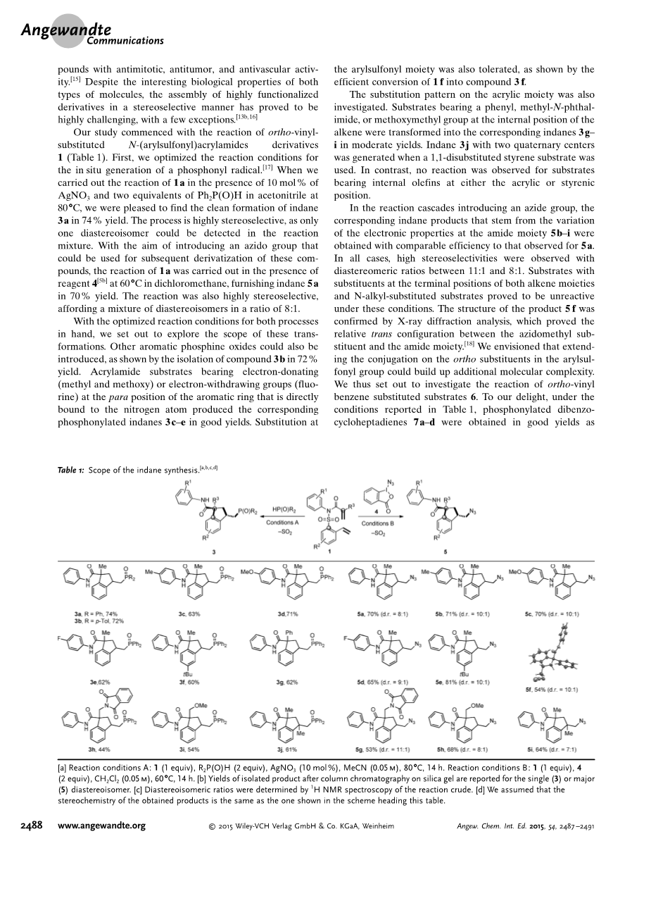 我们的研究开始于邻乙烯基取代的N-(芳基磺酰基)丙烯酰胺衍生物1(表1)的反应。首先,我们优化了原位生成膦酰基的反应条件[17]。当我们在80℃下进行10mol%AgNO3和2当量Ph2P(O)H在乙腈中的反应时,我们很高兴能以74%的产率发现茚满3a的干净形成。该过程是高度立体选择性的,因为在反应混合物中只能检测到一种非对映异构体。为了引入可用于随后衍生这些化合物的叠氮基团,1a的反应在试剂4 [5b]存在下于60℃在二氯甲烷中进行,从而以70%产率提供茚满5a。该反应也是高度立体选择性的,得到比例为8:1的非对映异构体混合物。