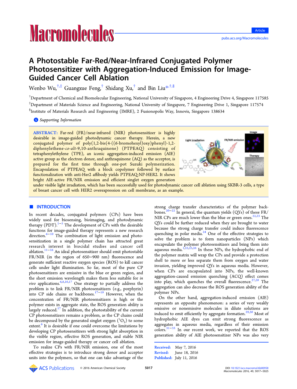 在这篇文章中,我们报道了具有AIE特性和良好的ROS生成能力的新型FR/NIR CP的设计和合成。四苯基乙烯(TPE)是标志性的AIE活性基团之一,迄今报道的几乎所有含有TPE基团的CP都是AIE活性的(图S1显示了一些例子)。另一方面,已经开发了蒽醌(AQ)来构建具有非常小的Delta;Est值(最低单重态(S 1)和最低三重态(T 1)之间的能隙)的FR/NIR染料1))(ChartS2)。小Delta;Est值将有利于系统间交叉(ISC)过程,这可能在光照射下产生有效的1 O2。在这个贡献中,通过使用TPE作为电子供体,AQ作为电子受体,已经制备了PTPEAQ的新CP(方案1)。正如预期的那样,从TPE到AQ的强电荷转移使聚合物FR/NIR发射,并且聚合物也继承了TPE的AIE特性。而且,聚合物具有耐光性,在白光照射下可以产生高效的1 O2。随后,制备两种类型的PTPEAQ-PEG-NP和PTPEAQ-NP的NPs以将PTPEAQ引入水性介质中用于图像引导的癌细胞消融。我们发现这两种NPs具有不同的荧光强度和ROS生成能力,抗HER2亲和功能化的PTPEAQ-NPs可以选择性靶向SKBR-3癌细胞进行图像引导的癌细胞消融。