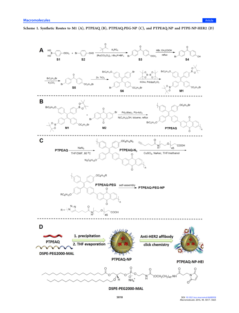 方案1.合成M1(A),PTPEAQ(B),PTPEAQ-PEG-NP(C)和PTPEAQ-NP和PTPE-NP-HER2(D)。这促使我们设计和合成一种AIE活性的FR/NIR CP光敏剂,以测试其是否能够继承FR/NIR AIE光敏剂的良好性能,但是具有改进的材料可加工性。