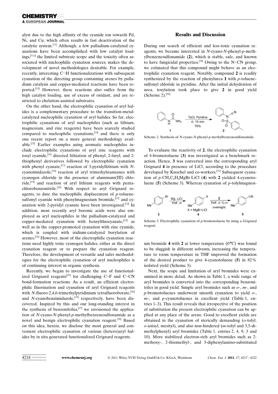 最近,我们开始研究使用官能化格氏试剂[25]来解决C-F和C-CN键形成反应的难题。 结果,已经发现分别用N-氟-2,4,6-三甲基吡啶鎓四氟硼酸盐[26]和N-氰基苯并咪唑[15]进行芳基格氏试剂的有效亲电氟化和氰化。 受此启发和我们长期以来对苯甲腈合成的兴趣[27],我们设想了N-氰基-N-苯基-对甲基苯磺酰胺作为新型和良性亲电子氰化试剂的应用[28]。基于这一想法在本文中,我们通过原位生成功能化的格氏试剂,揭示了各种(杂)芳基卤化物的最普遍和方便的亲电性氰化。