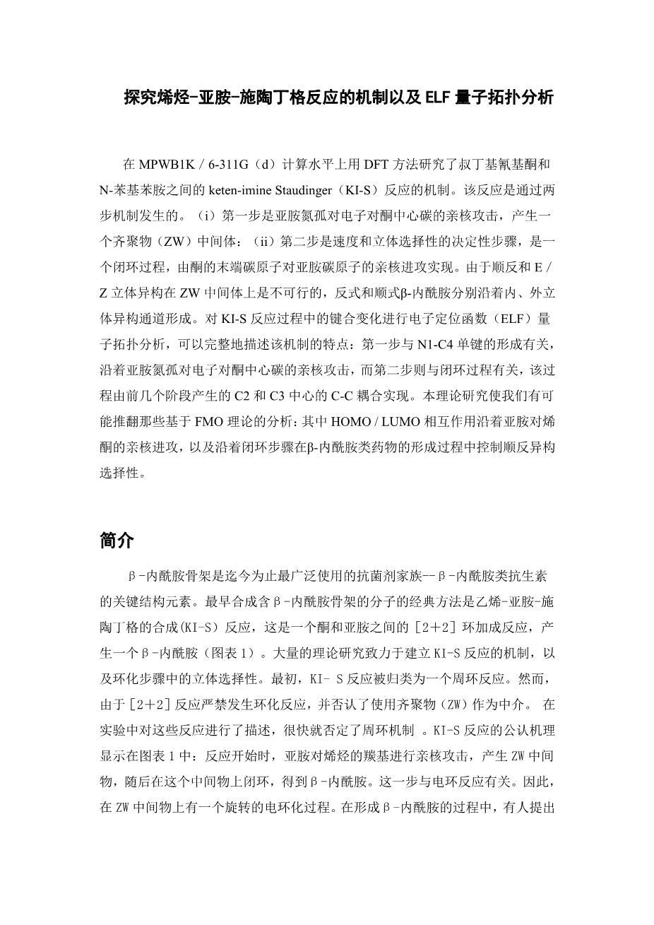 探究烯烃-亚胺-施陶丁格反应的机制以及ELF量子拓扑分析外文翻译资料