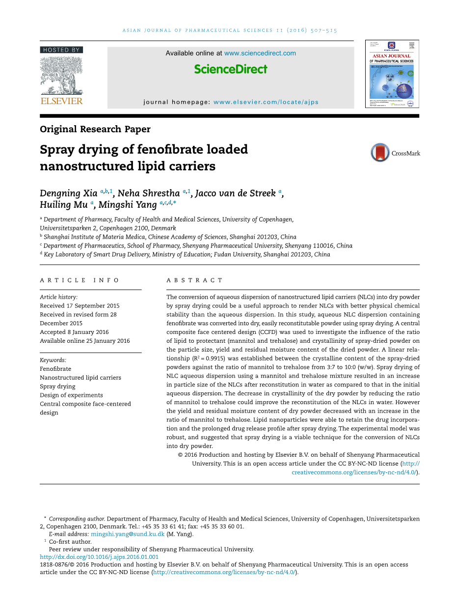 将纳米结构脂质载体(NLCs)的水分散体转化为干粉通过喷雾干燥可能是使NLC具有更好的物理化学品的有用方法稳定性高于水性分散体。在本研究中,含水NLC分散体含有使用喷雾干燥法将叶酸盐转化成干燥,容易复原的粉末。中央复合面心设计(CCFD)用于研究该比例的影响的保护剂(甘露醇和海藻糖)和喷雾干燥粉末的结晶度干燥粉末的粒度,产率和残留水分含量。在喷雾干燥的结晶含量之间建立线性关系(R2 = 0.9915)相对于甘露糖醇与海藻糖的比率为3:7至10:0(w / w)的粉末。喷雾干燥使用甘露醇和海藻糖混合物的NLC水分散体导致增加在水中重构后的NLC的粒径与初始相比水分散体。通过降低比例,干粉的结晶度降低的甘露醇与海藻糖可以改善NLCs在水中的重组。然而,干粉的产量和残留水分含量随着增加而下降甘露醇与海藻糖的比例。 脂质纳米颗粒能够在喷雾干燥后保持药物的掺入和延长的药物释放效果。实验模型是坚固的,并且建议喷雾干燥是将NLCsin转化为干粉的可行技术。