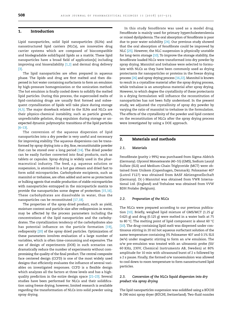 脂质水分散体的转化纳米颗粒成为干粉是非常有用和必要的以提高稳定性。 水分散体可以是反式 - 通过喷雾干燥形成干燥,可再生的粉末可以长期储[14]。干粉可以轻松地进一步转化成最终产品,如片剂或胶囊。 喷雾干燥广泛用phar-制药业。饲料,例如。水溶液或悬浮液在热气流中雾化并快速干燥形成固体微粒。碳水化合物赋形剂,如甘露醇或海藻糖,通常加入并用作保护剂或能够产生稳定的微粒的填充剂纳米颗粒包埋在微粒基质中为纳米颗粒提供一定程度的保护[15,16]。这些碳水化合物可溶于水, 因此纳米颗粒可以重组[17,18]。