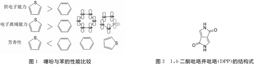 有机聚合物太阳能电池因具备成本低廉、材料合成工艺简单、容易加工和成膜、电池结构多样化等优点因而受到广泛关注[1]。有机聚合物太阳能电池基于光伏效应的原理[2],其光电转换过程主要包括以下三个方面:(1)聚合物给体材料吸收光子使电子跃迁至激发态,产生激子;(2)激子在给体相扩散,当其扩散到给体和受体界面时,在给体材料的lumo能级和受体材料的lumo能级差作用下,通过电子转移分离为自由载流子;(3)自由载流子在内建电场的作用下迁移到正负两极形成电流回路。传统的聚噻吩类衍生物制备的电池光电转换效率(pce)达到5%以上[3],但由于其带隙在2.0 ev左右,它只能吸收波长为650 nm以下的太阳光,而太阳光中相当大的一部分能量集中在800nm后的近红外区,因而存在对太阳光吸收不充分等问题。研究发现,带隙更窄的聚合物能吸收波长范围更宽的太阳光[4]。因此,为了有效地利用太阳光的能量,研究的目光投向了带隙较窄的d-a型窄带隙共轭聚合物[5],其通常是由富电子基团(给体单元)和缺电子基团(受体单元)共聚而成。目前,给体单元一般采用噻吩和苯等富电子基团,按结构的不同,大致可划分为噻吩构建的给体单元、苯构建的给体单元以及噻吩和苯共同构建的给体单元[2,6-7]。相比苯环,噻吩的供电子能力和电子离域能力都更优(如图1所示),因此,三者按供电子能力的相对强弱又依次分为强供电子基团、弱供电子基团和中等供电子基团。而受体单元在窄带隙共轭聚合物中的主要作用是调节聚合物的帯隙和能级,拓宽聚合物对太阳光的响应范围的同时得到较大的开路电压[8]。受体单元必须具备拉电子能力强、共平面性好等特点[9-10]。在诸多受体单元中, 吡咯并吡咯二酮(dpp,图2)因为具备优良的共平面性和强烈的拉电子能力成为了受体单元研究中的热门对象之一[11-15]。首先,dpp单元的平面共轭结构使dpp类共聚物呈现强烈的π-π叠加,从而起到增强电荷迁移率的功效;其次,dpp内部的亚酰胺结构具有强烈的拉电子作用,加强了聚合物内部的电子转移(ict),能较好地调控聚合物的能级和帯隙,拓宽聚合物对太阳光的响应范围和吸收谱带[16-19]。