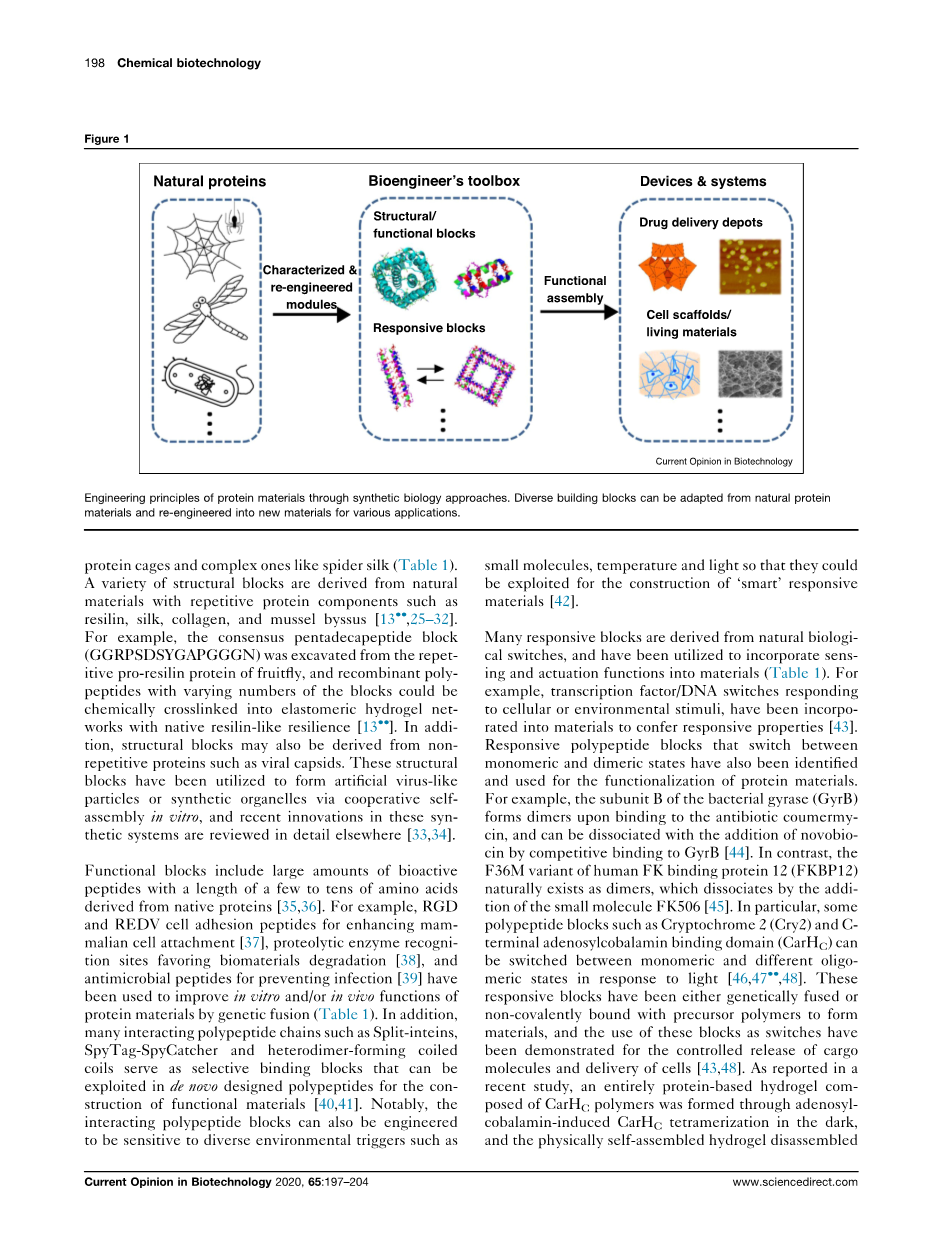功能块包括大量生物活性物质长度为几十到几十个氨基酸的肽来源于天然蛋白[35,36]。例如,RGD和REDV细胞粘附肽,可增强哺乳动物细胞的附着力[37],有助于生物材料降解的蛋白水解酶识别位点[38]和预防感染的抗菌肽[39]用于改善小鼠的体外和/或体内功能蛋白质材料通过基因融合(表1)。此外,许多相互作用的多肽链,例如Split-inteins,SpyTag-SpyCatcher和形成异二聚体的卷曲线圈用作选择性结合块,可以从头设计的多肽用于功能材料的构建[40,41]。值得注意的是相互作用的多肽块也可以被工程对各种环境触发敏感,例如小分子,温度和光,以便它们可以被用于构建“智能”响应式材料[42]。