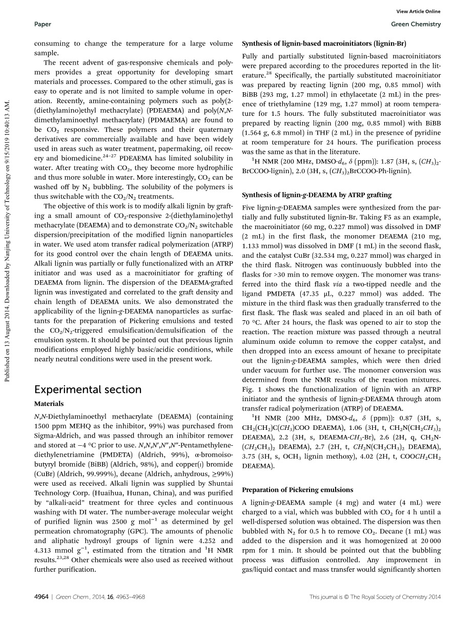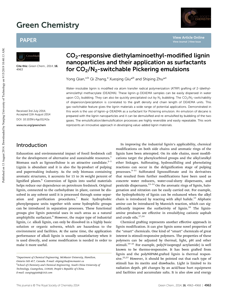近年来气体敏感型学物质和聚合物的出现为开发智能材料和工艺提供了巨大的机遇。与其他刺激相比,气体比较容易操作,且不受样品体积的限制。近年来,有人发现含胺聚合物如甲基丙烯酸2-(二乙氨基)乙酯(PDEAEMA) 和聚甲基丙烯酸N,N-二甲氨基乙酯(PDMAEMA)是CO2敏感型的。这些聚合物及其季铵盐衍生物已被商用并且广泛应用于水处理、造纸、采油和生物医药等领域。PDEAEMA在水中的溶解度有限。经过CO2处理后,它们变得更亲水,因此更溶于水。更有趣的是,CO2可以被N2鼓泡洗掉。因此,聚合物的溶解度可以经过控制CO2/N2来改变。本工作的目的是通过接枝少量CO2敏感型2-(二乙基氨基)甲基丙烯酸乙酯(DEAEMA)对碱木质素进行修饰,并验证改性木质素纳米粒子在水中的CO2/N2可改变分散/沉淀。我们采用原子转移自由基聚合(ATRP),因为它能很好地控制DEAEMA单位的链长。用ATRP引发剂对碱木质素进行了部分或全部的功能化,并作为木质素接枝DEAEMA的大引发剂。我们研究了DEAEMA接枝木质素的分散性与接枝密度和DEAEMA单元链长有关。此外,我们还论证了木质素-g-DEAEMA纳米粒子作为表面活性剂制备皮克林乳液的适用性,并测试了该乳液体系的CO2/N2触发乳化/破乳。应该指出的是,以前的木质素改性是在高碱性/酸性条件下进行的,而在本研究中采用的是接近中性的条件。