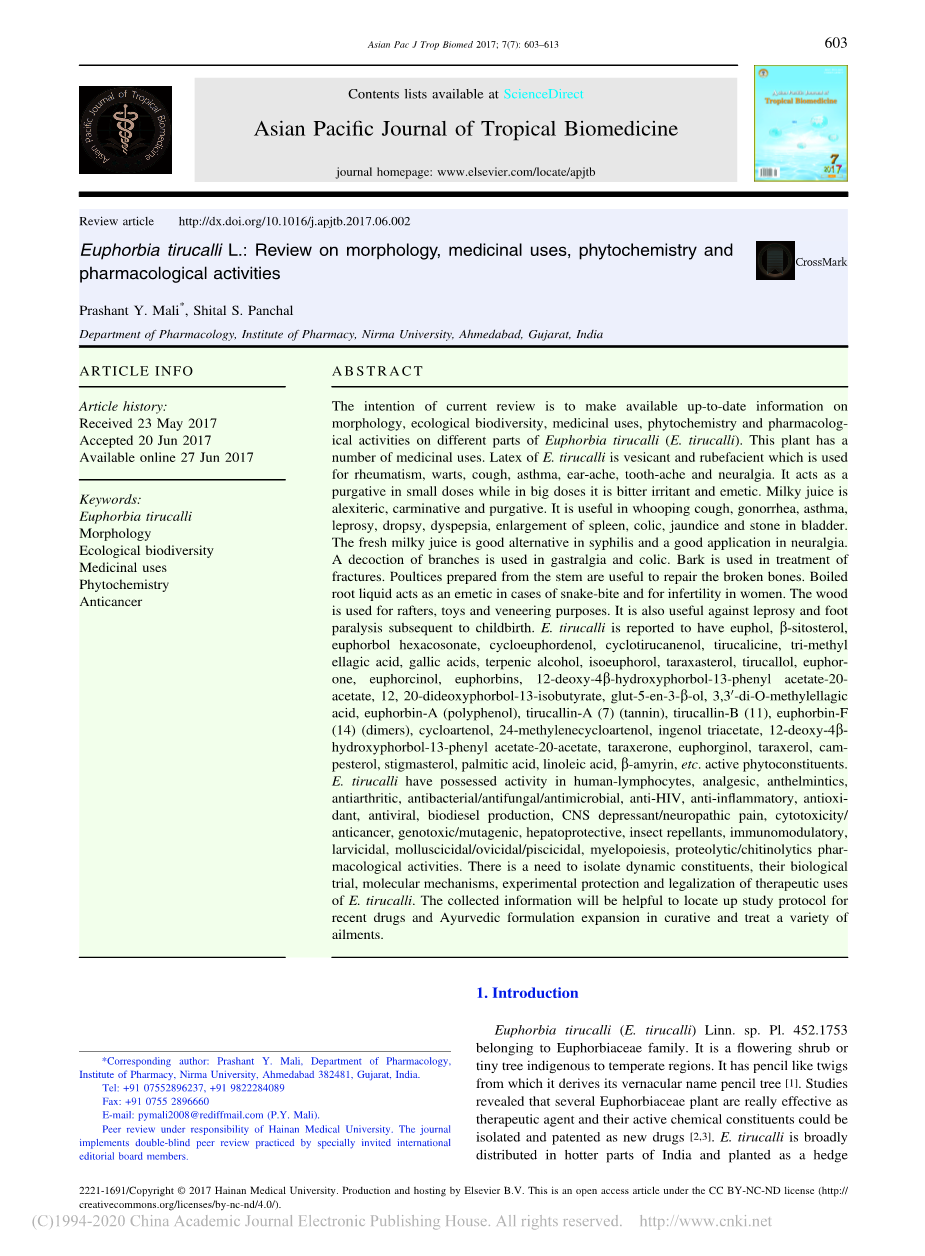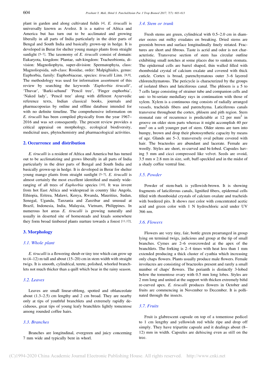 绿玉树:形态,药物用途,植物化学和药理活动外文翻译资料
