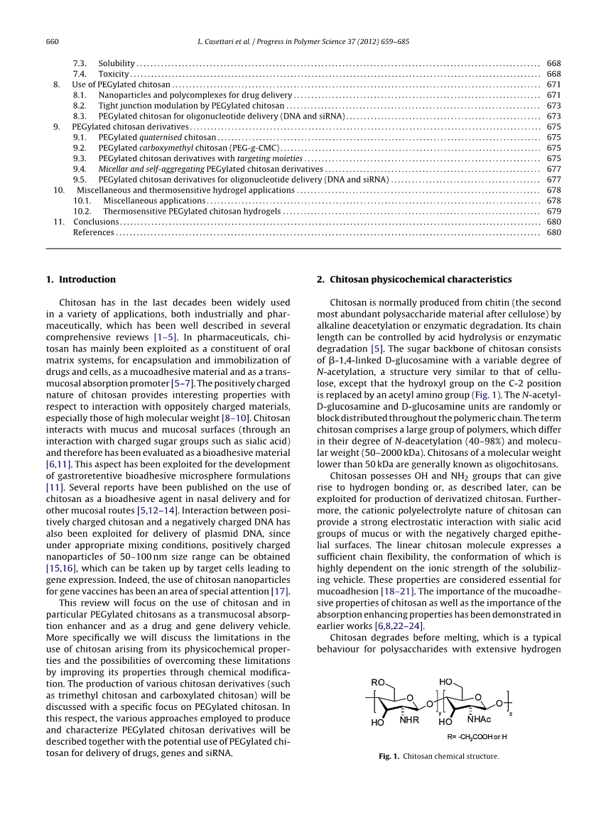 脱乙酰壳多糖,在过去数十年来已广泛用于在各种应用中,无论是在工业和药学。在制药方面,脱乙酰壳多糖主要作为口腔构成基质系统,用于封装和固定化药物和细胞,粘膜粘附材料和作为粘膜促进吸收。带正电荷的壳聚糖对于相互作用是良好的材料,特别是在超高分子量的化合物中。壳聚糖带有粘液和粘膜表面的相互作用(通过具有带电糖基团如唾液酸),因此已被评价为生物粘附材料,这一方面被用来制备胃滞留的生物黏附微球制剂。一些报告已经将脱乙酰壳多糖作为鼻递送和生物粘附剂。带电壳聚糖和带负电荷的DNA具有之间也具有积极的相互作用,这一特点也已开发用于递送质粒DNA中,的确,壳聚糖纳米颗粒用于基因疫苗一直是特别关注的区域。这次审查将集中在利用壳聚糖和特定聚乙二醇化的脱乙酰壳多糖作为经粘膜吸收增强剂和作为药物和基因递送载体。更具体地说,我们将从它的理化性质出发,讨论通过化学修饰提高其性能,克服目前一些限制的可能性。我们将对聚乙二醇化壳聚糖进行重点讨论,包括制备聚乙二醇壳聚糖的方法,表征,PEG化壳聚糖衍生物的潜在用途、PEG化脱乙酰壳多糖在递送药物、基因和siRNA领域的应用。