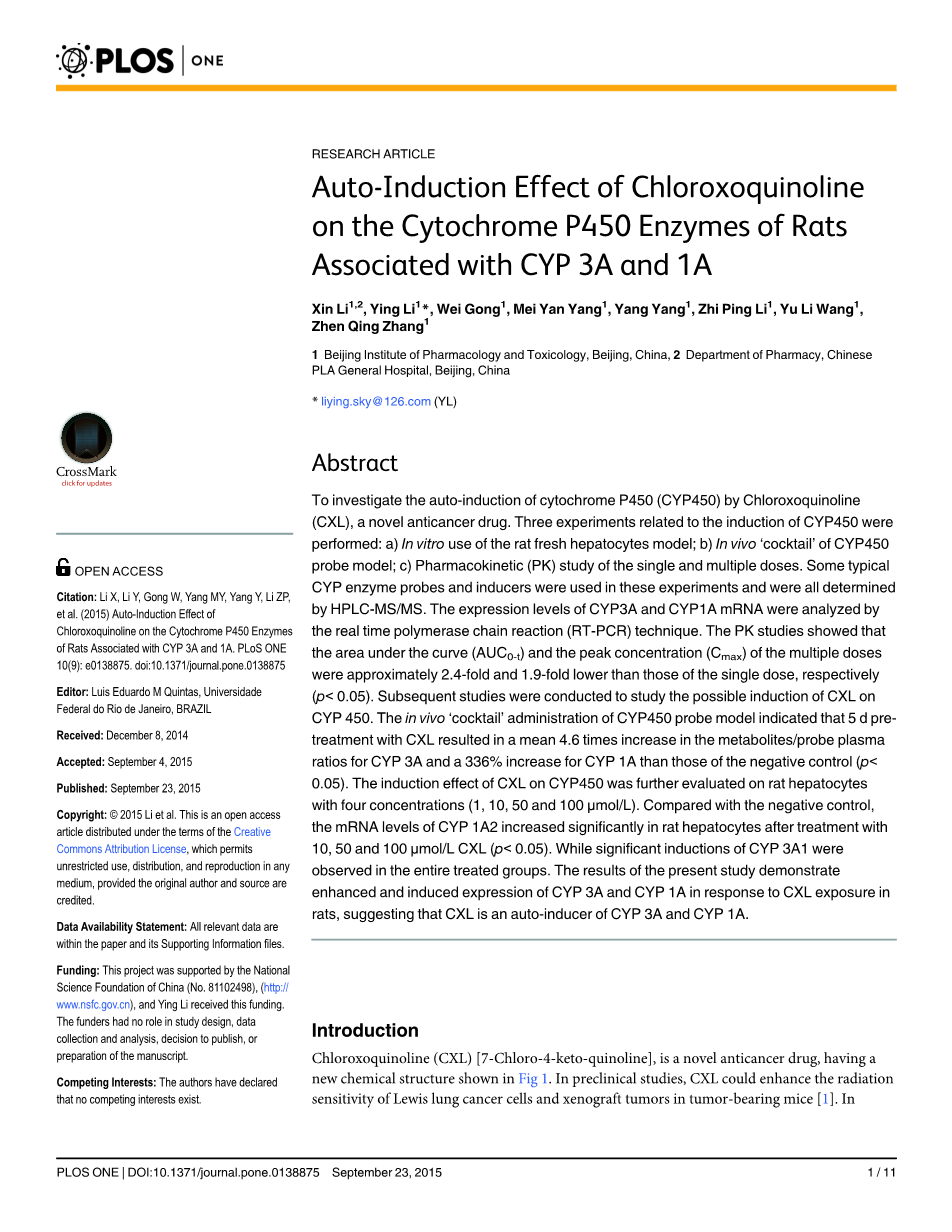 为探讨一种新颖的抗肿瘤药物---氯喹啉(CXL),对CYP450酶的自动诱导作用,本研究开展了三项关于CYP450酶的诱导实验:a)体外使用大鼠原代肝细胞模型;b)体内建立CYP450酶探针的“鸡尾酒”模型;c)单剂量和多剂量给药的药代动力学(PK)研究。这些实验都运用了几种典型的CYP酶探针底物和诱导剂,而且它们都可以通过HPLC-MS/MS检测。另外,还可以通过实时聚合酶链式反应(RT-PCR)技术来检测CYP3A和CYP1A的mRNA的表达水平。其中,PK研究结果表明,多剂量给药时,其血药浓度与时间曲线下的峰面积(AUC0-t)和峰值浓度(Cmax)分别要比单剂量给药时小2.4倍和1.9倍左右(P lt;0.05)。后续研究探讨了CXL对CYP450的可能诱导作用。另外,CYP450探针的体内“鸡尾酒”模型结果显示,当用CXL预处理样品5天时,CYP3A酶的代谢物/探针血浆比率要比阴性对照组高平均4.6倍; 而CYP1A酶的代谢物/探针血浆比率要比阴性对照组高336%(P lt;0.05)。再通过四种不同浓度(1,10,50和100mu;mol/L)的CXL来进一步评估其对大鼠肝细胞CYP450的诱导作用。与阴性对照组相比,用10,50和100mu;mol/L的CXL(P lt;0.05)治疗大鼠肝细胞后的CYP1A2的mRNA水平具有显著的增加。而对CYP3A1的显著诱导则在所有的浓度中都可观察到。本研究的结果表明CYP3A和CYP1A的表达增强和诱导是响应于CXL作用于大鼠的结果,这说明CXL是CYP3A和CYP1A的自动诱导物。