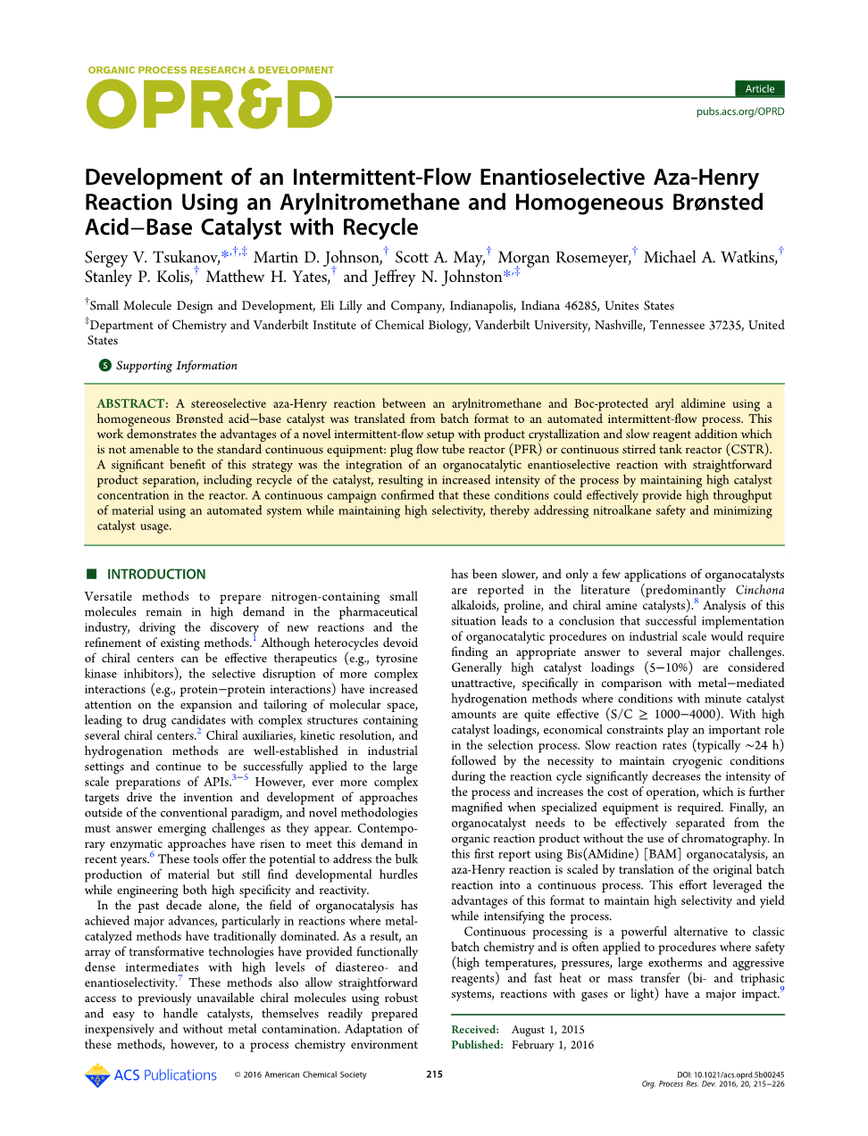 Aza-Henry反应存在空间立体选择性,在Arylnitromethane和Boc-protected芳基醛亚胺两个基团之间发生反应,使用均相布朗斯特酸-碱催化剂回收进行转化,此过程为批量处理格式自动间歇流过程。这项研究表明一种新型的间歇流动设置的优点:产物结晶和缓慢的试剂加入,标准的连续设备不适合这样的方法,比如:塞流式反应器(PFR)或连续搅拌釜式反应器(CSTR)。这一方法的显著优势是使有机催化的对映选择性反应中产品分离简单化,包括催化剂的回收,在反应器中保持较高的催化剂浓度,从而提高了过程的强度。一个连续的系统,确保有效地提供物质高生产量,使用自动化系统,同时保持高选择性,从而保证硝基烷烃安全使用和催化剂用量最小化。