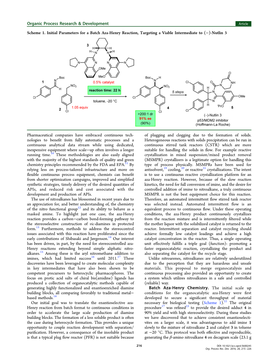 我们最初的目标是将手性氮杂-亨利反应从批处理格式连续条件为了加快大规模生产二胺构建块。一个不溶性产物的形成往往是在杂环形成情况。这提供了一个独特的机会,几个反应与分离/纯化发展。然而,由于不溶性的产品,一个典型的平推流反应器(再生)是不合适的,因为堵塞,堵塞由于固体的形成。有固体沉淀的非均相反应能在更适合处理固体的流动的连续搅拌釜式反应器(CSTR)中运行。例如在混合悬浮混合产物去除反应结晶(MSMPR)结晶器是处理这类过程的物理合理的选择。除结晶器(MSMPR)已经被用于抗溶剂的冷却、反应或结晶。