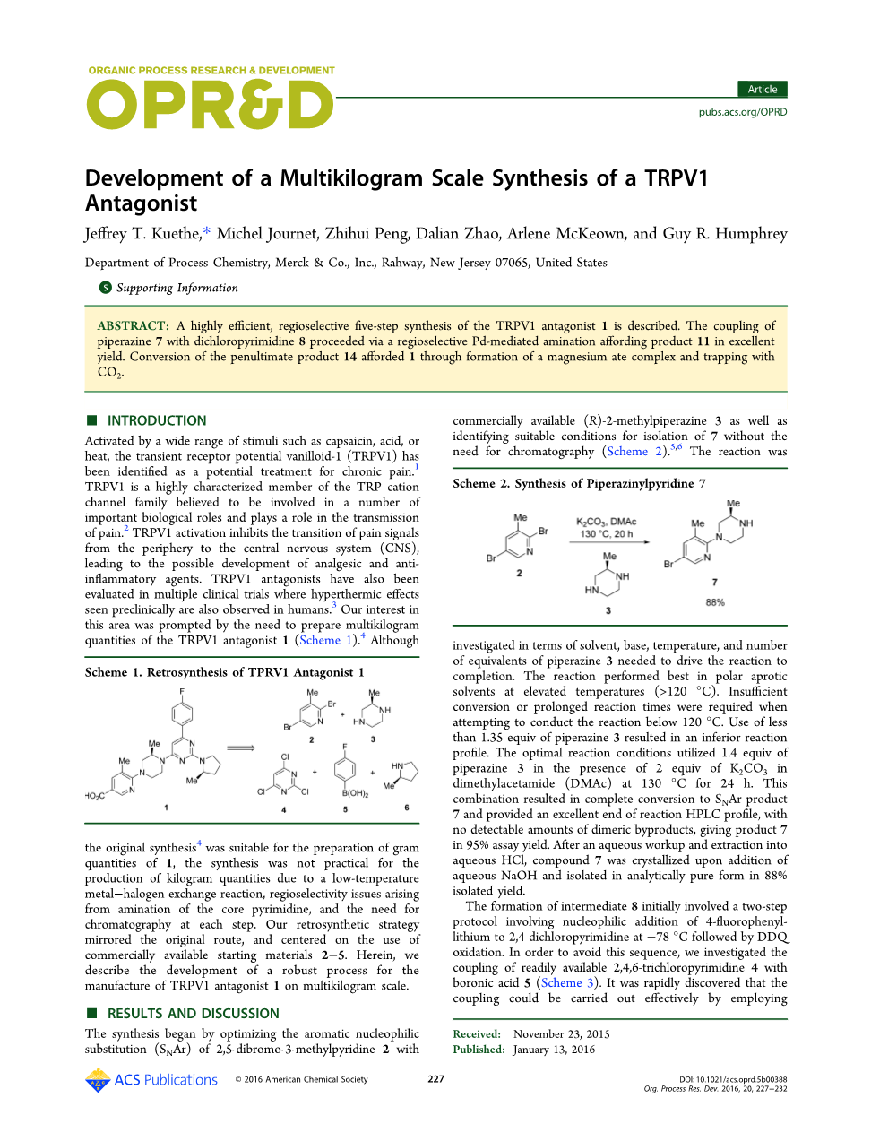 通过广泛的刺激如辣椒素、酸或活化热,瞬时受体电位香草酸亚型1(TRPV1)被确定为一种慢性疼痛的潜在治疗。TRPV1是TRP阳离子通道家族的高度表征成员,并且该家族被认为参与若干重要的生物学作用和疼痛传输的作用。TRPV1可以激活抑制疼痛信号从外围过渡到中枢神经系统(CNS),导致止痛和抗炎剂的可能性发展。TRPV1拮抗剂已进行多个临床试验评价,临床前可看到温热效果,并已在人类中观察。我们在这一领域的兴趣是由于需要准备多公斤数量TRPV1拮抗剂1(流程1)。虽然最初合成适于1克量的制备,但不适于生产千克数量,由于低温金属 - 卤素交换反应,区域选择性问题而产生的从嘧啶中心胺化,并且在每个步骤均需要层析。我们的逆合成策略镜像原始路由,并集中利用市售的起始原料。在此,我们描述了一个制造多千克规模TRPV1受体拮抗剂1的强大发展过程。