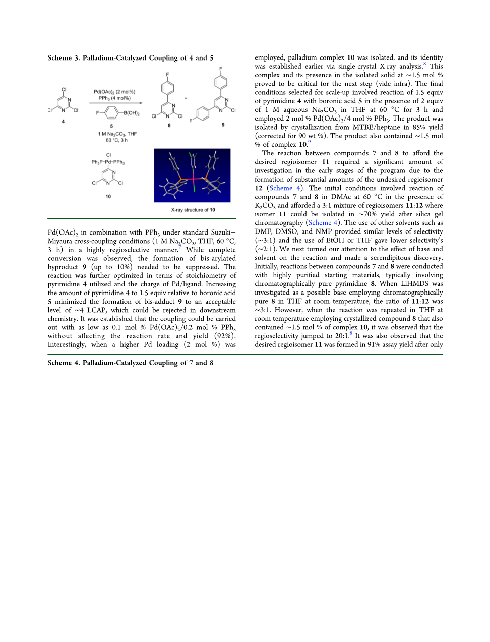 中间体8开始形成介入的两步协议涉及在-78℃4-氟苯基锂与2,4-二氯嘧啶亲核加成后进行DDQ氧化。为了避免该序列中,我们调查了容易获得的2,4,6-三氯嘧啶与硼酸的偶合(方案3)。耦合可以在标准Suzukiminus;Miyaura交叉偶合条件(1M的碳酸钠,THF,60℃,3小时)下通过加入Pd(OAC)2以高度选择性的方式与PPH 3组合而有效地进行被迅速发现。然而观察到完全转化时双 - 芳基化副产物9的形成(高达10%)需要被抑制。该反应中所用的嘧啶的化学计量和充电的Pd /配位体的条件进一步优化。嘧啶的量增加至1.5当量相对于硼酸最小化双加合物的形成达一个可接受的4 LCAP水平,这可能会在下游化学被拒绝。可以与低至0.1摩尔%的Pd(OAC)2/ 0.2摩尔%PPH 3进行,而不会影响反应速率和产率(92%)的耦合被建立。有趣的是,当采用较高的Pd负载量(2%摩尔),钯配合物被分离,并先前通过单晶X-射线分析证明自己的身份。这种复杂及分离的固体在~1.5摩尔%存在被证明是对下一个步骤(参见下文)是至关重要的。在60℃下3小时选择以与在2当量在THF中的1M Na2CO3水溶液的存在硼酸嘧啶的1.5当量的比例增加参与反应并采用2摩尔%的Pd(OAC)的最终条件2/4摩尔%PPH 3。将产物通过MTBE/庚烷以85%产率结晶分离(修正为90重量%)。该产品还包含~1.5%(摩尔)复杂化合物。