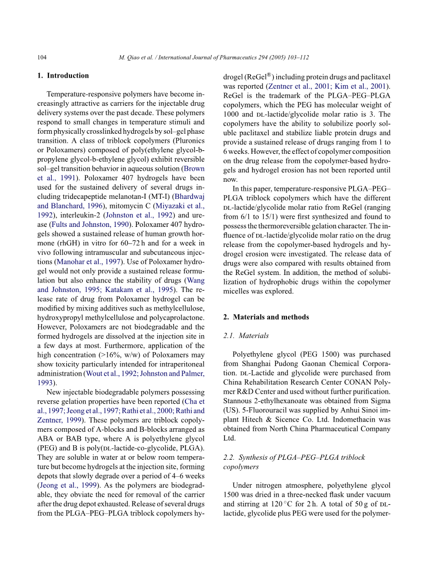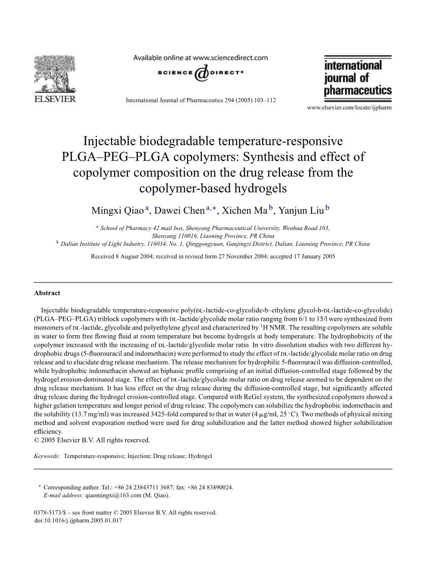 可注射的可生物降解的温敏性的聚丙交酯-乙交酯-聚乙二醇-聚丙交酯-乙交酯(PLGA–PEG–PLGA)三嵌段共聚物中丙交酯/乙交酯的摩尔比介于6/1~15/1,是以丙交酯、乙交酯和聚乙二醇的单体合成并由1H NMR 表征。所得到的共聚物在室温下可溶于水中形成自由流动的流体,在体温下则成为水凝胶。共聚物的疏水性随丙交酯/乙交酯的摩尔比增加而增加。通过两种疏水性不同的药物(5-氟尿嘧啶和吲哚美辛)的体外溶出试验来研究丙交酯/乙交酯的摩尔比对药物释放的影响并阐明药物释放的机制。亲水性5-氟尿嘧啶的释放机制为扩散控制,而疏水性的吲哚美辛则呈现出两相的特征,包括初始扩散控制的阶段和水凝胶溶蚀为主的阶段。丙交酯/乙交酯的摩尔比对药物释放的影响似乎是取决于药物释放机制,对在扩散控制阶段中的药物释放几乎没有影响,但在水凝胶溶蚀控制阶段影响显著。与Regel系统相比,所合成的共聚物显示出更高的凝胶化温度和更长的药物释放期。该共聚物可以溶解疏水性吲哚美辛,使其溶解度与在水中(4微克/毫升,25℃)相比增加3425倍(13.7毫克/毫升)。物理混合法和溶剂蒸发法两种方法用于药物增溶,后一种方法具有更高的增溶效率。