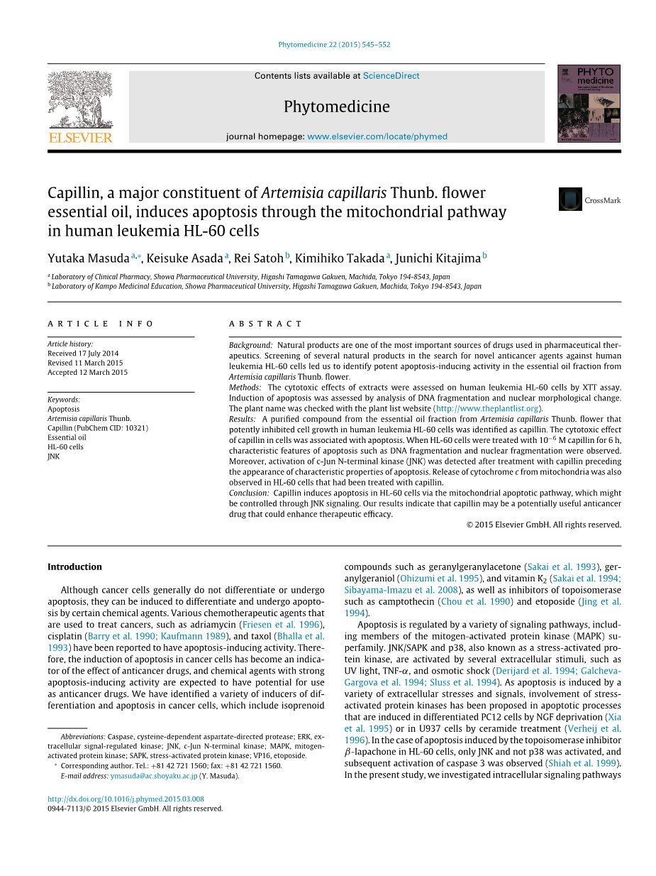 艾属物种被用作食品添加剂和传统草药,特别是在治疗疾病比如癌症、炎症、疟疾、肝炎、和微生物感染,这些物种中,茵陈蒿的花自古以来已被用来作为一种重要的生药(日文名为“chinko”),显示出各种药理作用,包括抗炎,抗过敏和抗癌活动,最近,在医疗中挥发油成分的使用已经引起越来越大的关注,因为已经有报告表明挥发油有潜在的化疗预防作用,它能通过诱导作用使肿瘤细胞系中的部分细胞凋亡。这些观察表明茵陈蒿花的挥发油部分可能是有益的癌细胞凋亡诱导剂。在目前的研究中,我们发现茵陈蒿挥发油的各种化合物成分中,茵陈二炔酮具有最强的细胞凋亡诱导活性。茵陈二炔酮是艾属物种的挥发油成分中的基本组成部分,并显示出重要的生物活性,如抗肿瘤、抗菌、抗菌和抗真菌活性。我们还证明了茵陈二炔酮对氨基末端激酶和应激活化蛋白激酶产生了强烈的诱导作用,并且没有激活丝裂原活化蛋白激酶家族其他酶类,例如细胞外信号调节激酶。本文详细介绍了茵陈二炔酮诱导HL-60细胞凋亡的特点。