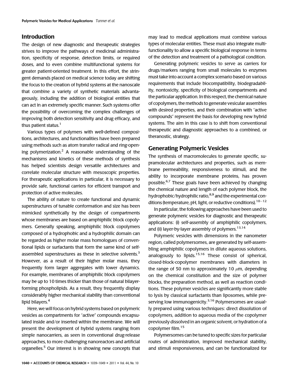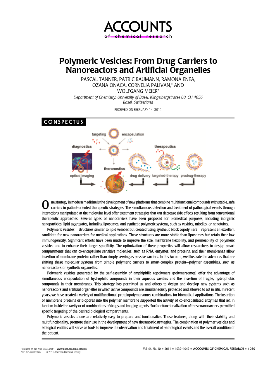聚合物囊泡—结构类似于脂质囊泡但使用合成嵌段共聚物创建—代表为医疗应用的新纳米载体的优秀候选。这些结构比起脂质体是更稳定,但保留了其低免疫原性。在提高聚合物囊泡的尺寸、膜的灵活性、渗透性方面和加强其目标特异性方面做出了重大努力。这些属性的优化将允许研究人员可以设计特殊间隔来同时封装敏感的分子,如 RNA、酶和蛋白质,和其膜允许插入的膜蛋白,而不是简单地服务于被动的载体。在这篇文章中,我们说明了移动这些分子系统从简单的聚合物载体智能复合到蛋白聚合物的发展过程,如纳米反应器或合成的细胞器。