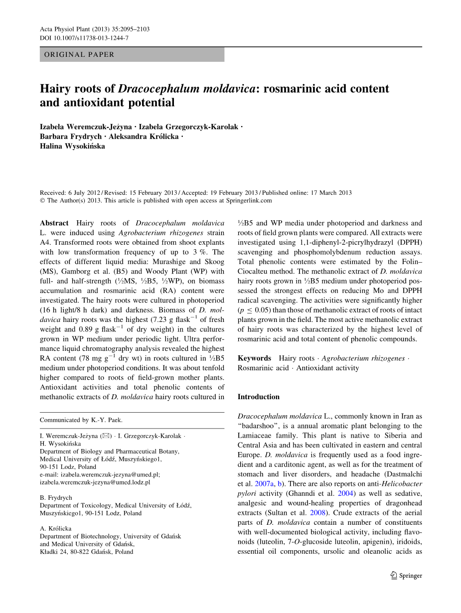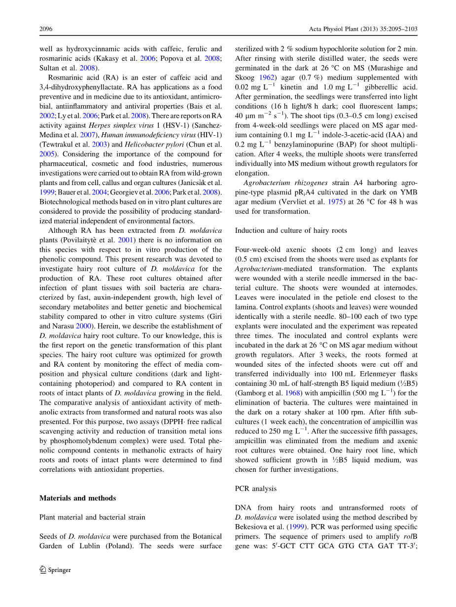 尽管RA已经能从香青兰植物中萃取(Povilaityte等2001),但此种相对于体外酚类化合物的生产没有任何信息。目前这个研究是主要调查香青兰的毛状根培养生产RA的。这些根的植物组织被土壤细菌感染后获得了比其他的体外培养系统更好的特征AST、生长素独立生长、次生代谢产物高层次和更好的遗传和生化稳定性相(Giri和narasu 2000)和Narasu 2000)cterized。在这里,我们描述了建立D. moldavica毛状根培养。据我们所知,这是在此植物物种的遗传转化的第一份报告。该毛状根培养通过监测媒体的COM位置和物理条件的影响(暗光及光含量)增长和RA的内容进行了优化,相比于香青兰的完整植物根,RA的含量在毛状根不断增长 。从改造自然和甲根提取物抗氧化活性的比较分析,还介绍。为此,使用两种测定方法(DPPH清除自由基的活性和磷钼络合还原过渡金属离子)。确定在毛状根和完整植物的根甲醇提取物总phe- nolic物质含量寻找抗氧化性能的相关性。
