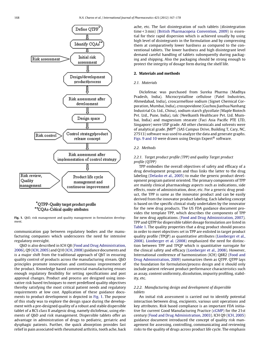 和过程都使用基于创新的风险的技术,以满足预定的质量目标,从而满足在低成本的最关键的患者的需要和法规要求而设计的。这些指导性文件,以产品开发中的应用中被描绘图。1、本研究的目的是用一个BCS II类镇痛药,即双氯芬酸的健壮和稳定的分散片剂的预先设计质量的发展过程中,探索了设计空间,使用的质量源于设计和风险管理的元素。分散片儿科,老年和吞咽困难的患者提供在药物管理的优势。此外,吸收快可治疗快速疼痛缓解类风湿关节炎,牙痛,背痛等,这种片剂(崩解时间lt;3分钟)的快速崩解有关(英国药典公约,2009年),是其迅速分散其中至关重要是通过使用在制剂的崩解剂的高级别和通过相比于常规片剂在相对 较低的硬度压缩它们通常实现。较低的硬度和高层次崩解片需要小心处理随后在包装和运输。也包装应该足以保护的货架寿命期间剂型的完整性强。