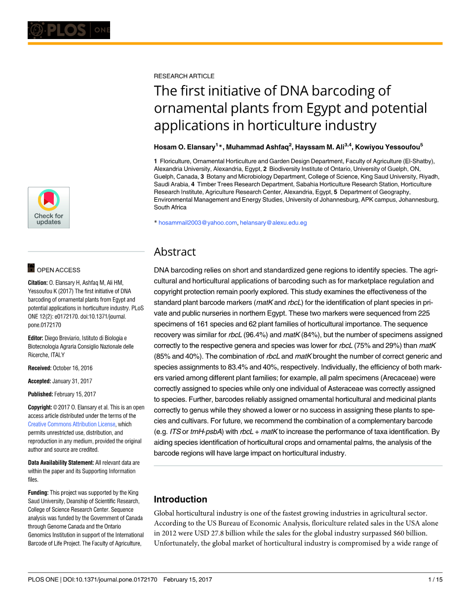 我们从161个种群收集了225个植物标本,其中,121份样本,是从亚历山大绿色绿洲苗圃取样,85份是从亚历山大科学院的苗圃取样,12份是从亚历山大蒙大纳地区的苗圃取样,5份是从亚历山大马里奥特区的卡迈勒地区的苗圃取样,还有2份是从亚历山大安东尼德斯花园中取样(2016年5月)。苗圃和花园的所有人都批准了数据的抽样和出版,没有一个植物是濒危或受保护的物种。为了检查观赏植物品种条形码的成功,收集了属于相同物种的几种个体,花或叶颜色不同的个体,包括三色堇和瓜叶菊等。样品收集、分析和购物凭证于2016年5月完成。 用数字图片进行地理参考和叶片样品在硅胶中干燥以进行后续分析。 样本信息以及图像可在埃及生命项目条码(www.boldystems.org)和S1表中找到。