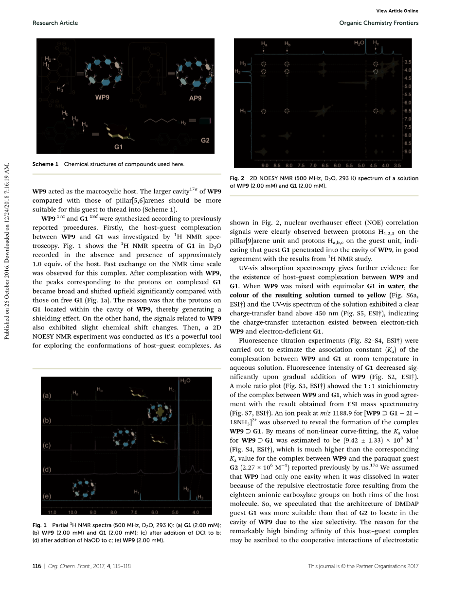 当将羟胺(40.0当量)加入到WP9和G1的混合溶液中时,对应于G1上的质子的峰基本上消失,而WP9的信号返回到未络合时的原始位置(图3c)。另一方面,当在WP9,G1和己胺的混合溶液中加入TFA(40.0当量)时,获得了类似于WP9和G1的原始溶液的1H NMR光谱(图3d)20,表明在该溶液中主客体络合物重新出现。因此,主客体络合物WP9sup;G1可以通过控制加入碱和酸的顺序可逆地控制其络合状态和未络合状态转换,则该络合物也可以作为碱/酸可控分子开关。
