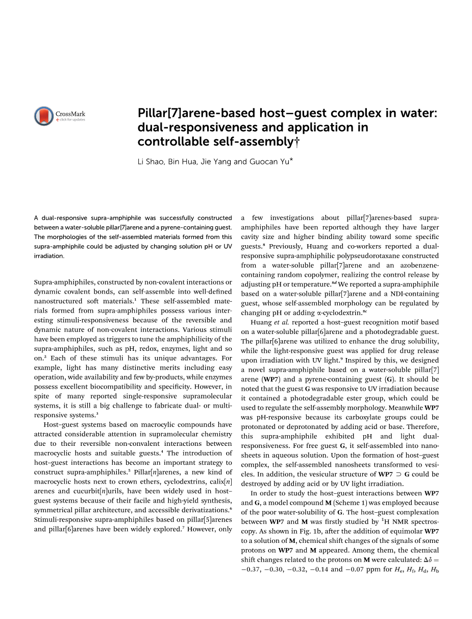 黄飞鹤等人报道了一个基于水溶性柱[6]芳烃和可光降解客体的主客体识别基元。柱状[6]芳烃被用来提高药物的溶解度,而响应光敏的客体被用于紫外光照射下的药物释放[9]。受此启发,我们设计了一种以水溶性柱[7]芳烃(WP7)和含芘的客体(G)构建的新型超两亲性聚合物。应该注意的是,客体G对紫外线照射有反应,因为它含有一个可光降解的酯基,可以用来调节自组装的形态。由于WP7的羧基可以通过添加酸或碱而被质子化或去质子化,因此WP7对pH具有响应。因此,这种超两亲性复合物具有pH和光双响应性。对于游离的客体G,它在水溶液中自组装成纳米片。主客体复合物形成后,自组装的纳米片转变为囊泡状。此外,添加酸或用紫外光照射会破坏WP7sup;G的泡状囊泡结构。