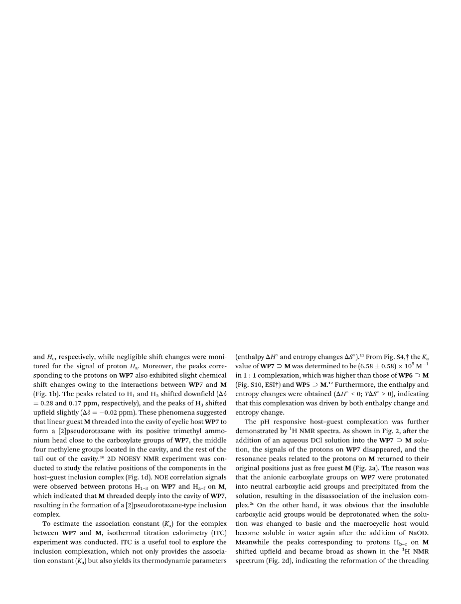 1H NMR谱进一步证实了pH响应的主-客体络合。如图1所示,在WP7sup;M溶液中加入DCI水溶液,WP7上的质子信号消失了,并且M上质子相关的共振峰恢复到原来的位置,与自由客体M一致(图2a)。原因是WP7上的阴离子羧酸基团被质子化成中性羧酸基团,并从溶液中沉淀,导致包含复合物的分离[2c]。另一方面,当加入NaOD后,溶液转变为碱性并且大环主体再次溶解在水中时,不溶性羧酸基团将被去质子化。于此同时,与M上的质子Hb-e相对应的峰移向高磁场,并且在1H NMR中的峰的区域也会变宽,这表明配合物WP7sup;M具有酸碱影响性。