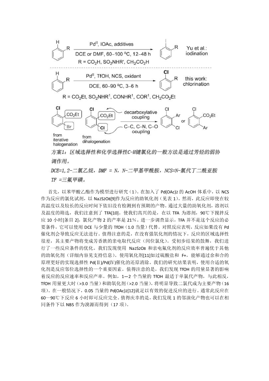 通过使用低价配位及导向基团,使缺电子芳烃中的C-H键具有 能进行区域选择性和化学选择性氯化和溴化反应的研究外文翻译资料