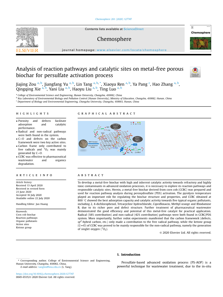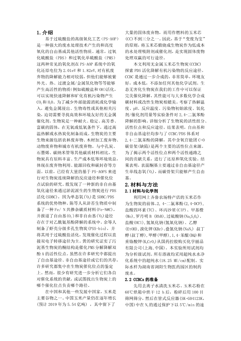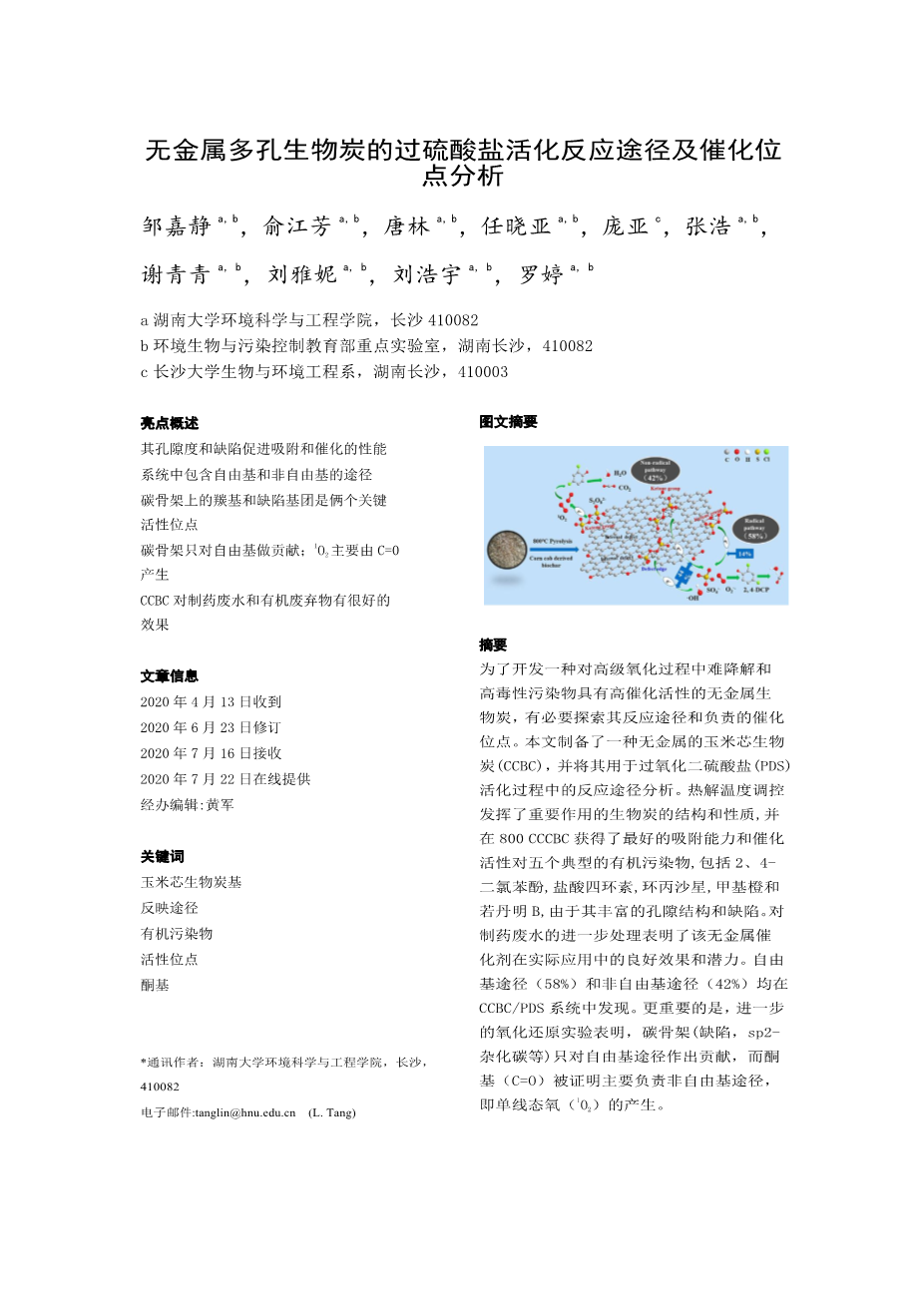 无金属多孔生物炭的过硫酸盐活化反应途径及催化位 点分析外文翻译资料