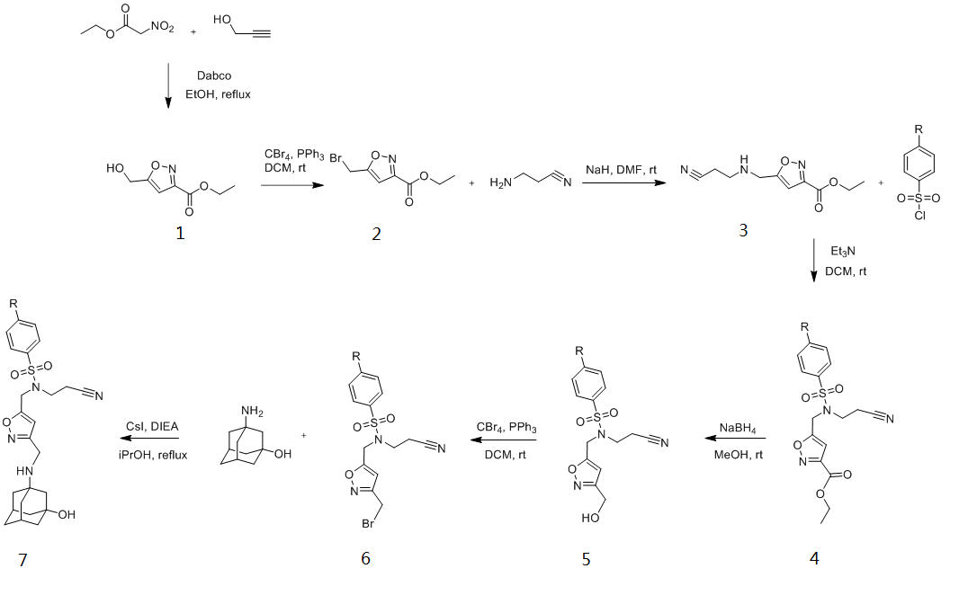 首先,炔丙醇与硝基乙酸乙酯在三乙烯二胺(dabco)催化剂作用下,生成异恶唑中间体1,接着经溴代反应生成中间体2,然后中间体2与3-氨基丙腈在氢化钠条件下经取代反应生成中间体3,中间体3和苯磺酰氯经磺酰化反应生成中间体4,接着经硼氢化钠的还原作用,生成对应的醇中间体5,5经溴代反应,生成溴代中间体6,最后溴代中间体6与金刚烷醇在碘化铯和n,n-二异丙基乙胺条件下生成目标化合物7。