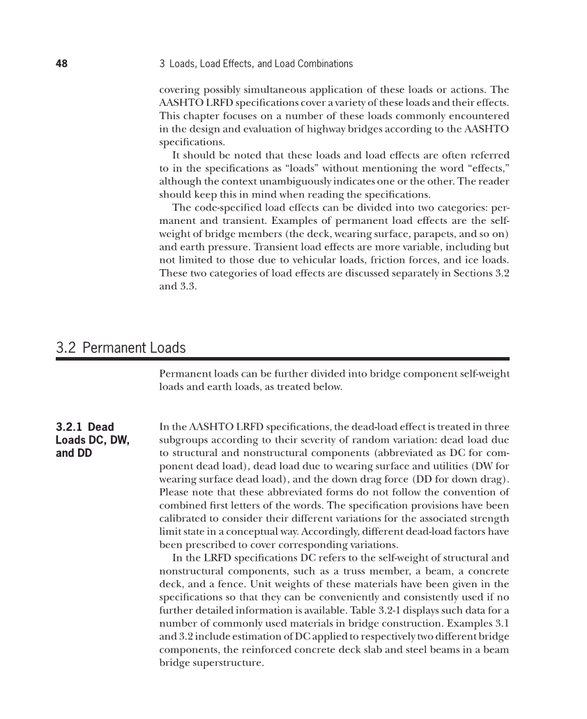 在规范中,DW是指磨损表面的自重,通常由沥青混凝土制成。这种自重与DC的分离与DC的处理方式不同,因为这样的磨损表面是在现场构造的,并且其正常状态的变化通常更为明显。因此,DW的负载系数要比DC高,因为DC通常是在工厂中制造的,并且其质量控制和数量控制更加严格。例如,钢梁,预应力混凝土梁,护栏等通常使用标准板,形状或模板制造,然后运送到要安装的位置。结果,可以更精确地控制它们的尺寸,从而可以在设计中更准确地估算它们。直流和直流静载的不同处理方式也代表了与上一代AASHTO桥梁设计和评估规范相比的显着变化。示例3.1和3.2还包括用于钢筋混凝土甲板的DW和在梁桥上部结构中的内部钢梁。